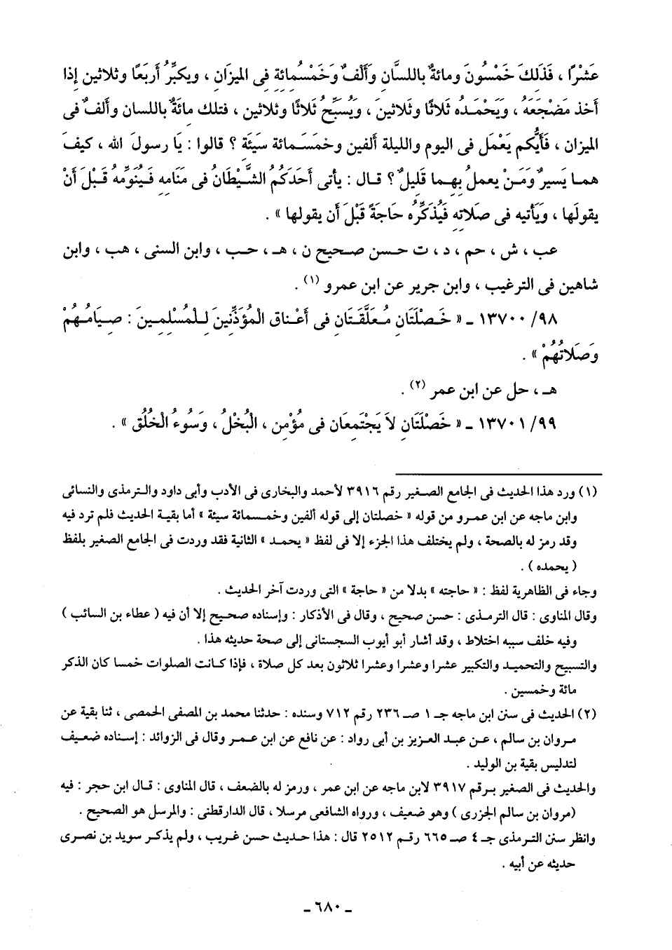 (¬1) ورد هذا الحديث في الجامع الصغير رقم 3916 لأحمد والبخارى في الأدب وأبى داود والترمذى والنسائى وابن ماجه عن ابن عمرو من قوله "خصلتان إلى قوله ألفين وخمسمائة سيئة" أما بقية الحديث فلم ترد فيه وقد رمز له بالصحة، ولم يختلف هذا الجزء إلا في لفظ "يحمد" الثانية فقد وردت في الجامع الصغير بلفظ (يحمده).