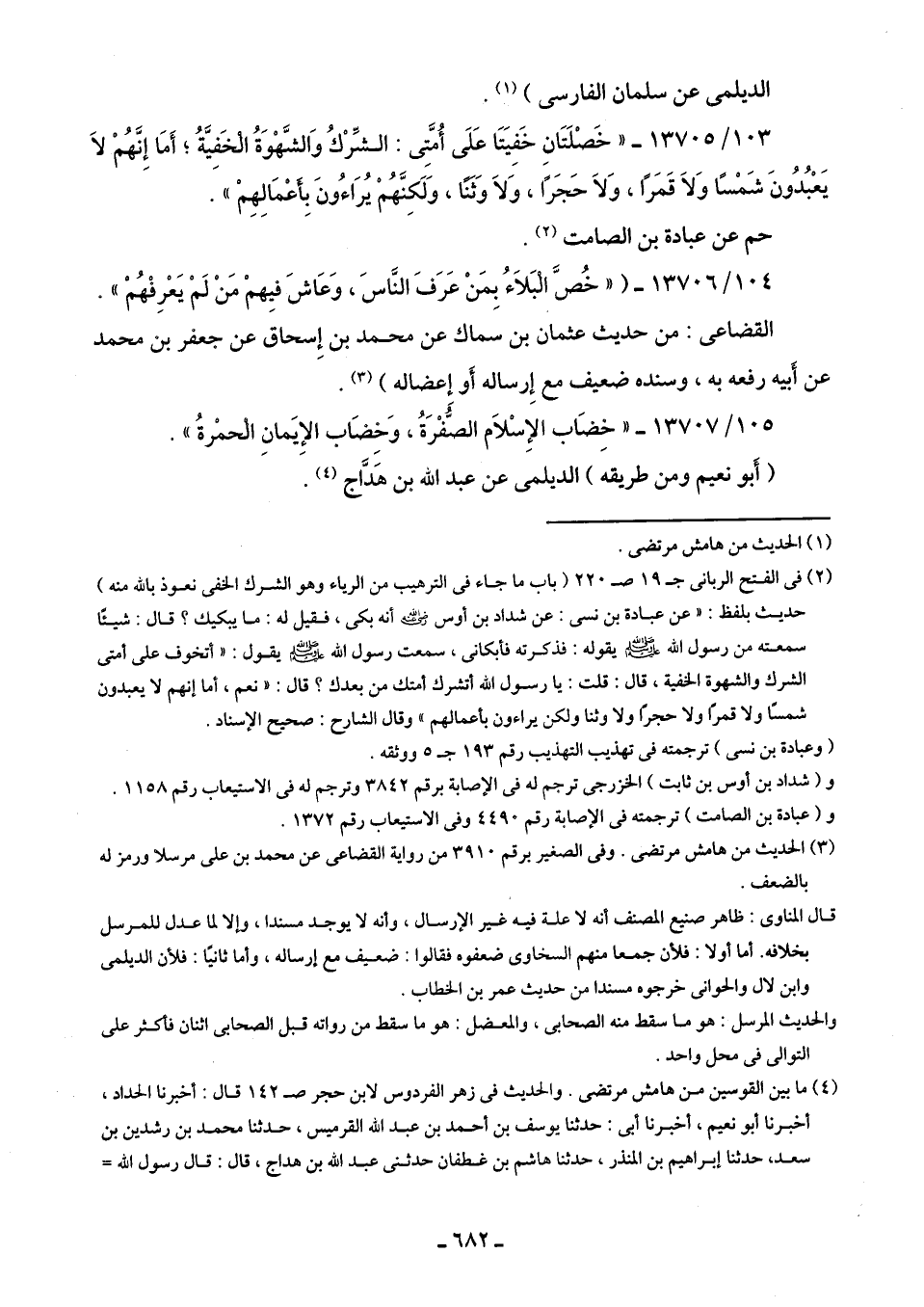 (¬2) في الفتح الربانى جـ 19 ص 220 (باب ما جاء في الترهيب من الرياء وهو الشرك الخفى نعوذ باللَّه منه) حديث بلفظ: "عن عبادة بن نسى: عن شداد بن أوس -رضي اللَّه عنه- أنه بكى، فقيل له: ما يبكيك؟ قال: شيئًا سمعته من رسول اللَّه -صلى اللَّه عليه وسلم- يقوله: فذكرته فأبكانى، سمعت رسول اللَّه -صلى اللَّه عليه وسلم- يقول: "أتخوف على أمتى الشرك والشهوة الخفية، قال: قلت: يا رسول اللَّه أتشرك أمتك من بعدك؟ قال: "نعم، أما إنهم لا يعبدون شمسًا ولا قمرًا ولا حجرًا ولا وثنا ولكن يراءون بأعمالهم" وقال الشارح: صحيح الإسناد.
