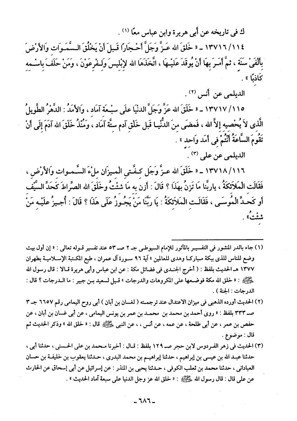 115/ 13717 - "خَلَقَ اللَّه عَزَّ وَجَلَّ الدُّنْيَا علَى سبْعَةِ آمَادِ، وَالأَمَدُ: الدَّهْرُ الطَّويلُ الَّذِى لَا يُحْصِيِهِ إِلَّا اللَّه، فَمضَى مِنَ الدُّنْيا قَبل خَلْقِ آدم سِتَّة آمَاد، وَمُنْذُ خَلَقَ اللَّه آدَمَ إِلَى أَنْ تَقُومَ السَّاعَةُ أَنْتُمْ فِى أَمَد وَاحِدٍ".