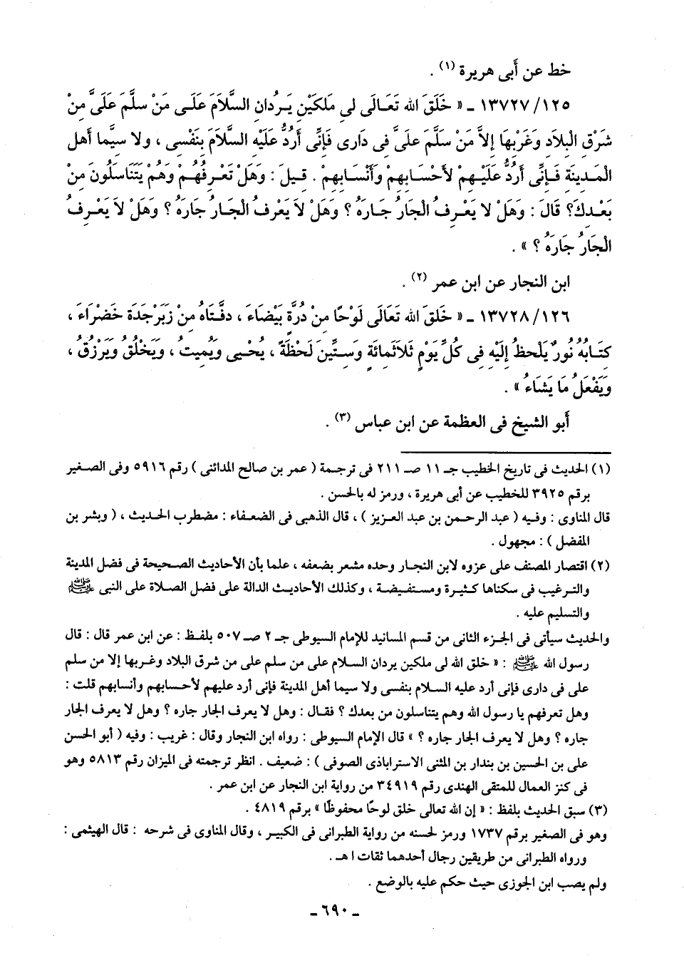 125/ 13727 - "خَلَقَ اللَّه تَعَالَى لِى مَلكَيْنِ يَرُدانِ السَّلَامَ عَلَى مَنْ سلَّمَ عَلَىَّ مِنْ شَرْقِ الْبِلَادِ وَغَرْبِهَا إِلَّا مَنْ سَلَّمَ عَلَىَّ فِى دَارى فَإِنِّى أَرُدُّ عَلَيْهِ السَّلَامَ بِنَفْسِى، ولا سِيَّما أَهل الْمَدِينَةِ فَإِنِّى أَرُدُّ عَلَيْهِمْ لأَحْسَابِهِمْ وَأَنْسَابِهِمْ. قِيلَ: وَهَلْ تَعْرِفُهُمْ وَهُمْ يَتَنَاسَلُونَ مِنْ بَعْدِكَ؟ قَالَ: وَهَلْ لا يَعْرِفُ الْجَارُ جَارَهُ؟ وَهَلْ لَا يَعْرفُ الْجَارُ جَارَهُ؟ وَهَلْ لَا يَعْرِفُ الْجَارُ جَارَهُ؟ ".