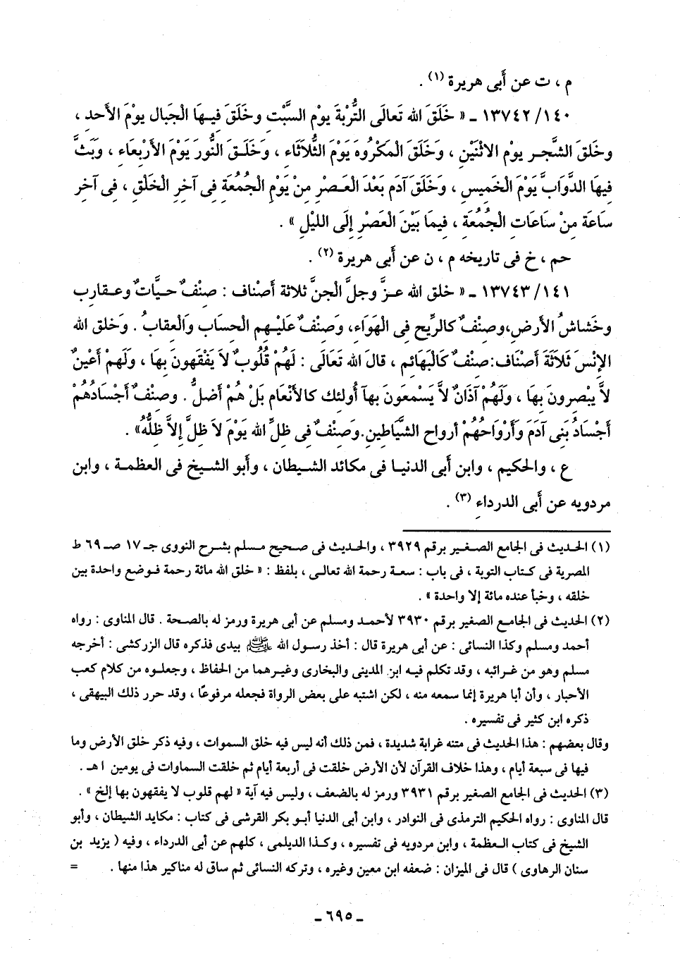 (¬2) الحديث في الجامع الصغير برقم 3930 لأحمد ومسلم عن أَبى هريرة ورمز له بالصحة. قال المناوى: رواه أحمد ومسلم وكذا النسائى: عن أَبى هريرة قال: أخذ رسول اللَّه -صلى اللَّه عليه وسلم- بيدى فذكره قال الزركشى: أخرجه مسلم وهو من غرائبه، وقد تكلم فيه ابن المدينى والبخارى وغيرهما من الحفاظ، وجعلوه من كلام كعب الأحبار، وأن أبا هريرة إنما سمعه منه، لكن اشتبه على بعض الرواة فجعله مرفوعًا، وقد حرر ذلك البيهقى، ذكره ابن كثير في تفسيره.