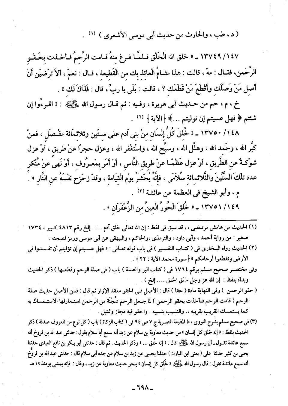 147/ 13749 - "خلق اللَّه الْخَلْق فلمَّا فرغ مِنهُ قامت الرحمُ فأخذت بِحَقْوِ الرحمن، فقال: مهْ، قالت: هذا مقامُ العائِذِ بِك مِن القَطِيعةِ، قال: نعمْ، أَلَا ترْضيْن أَنْ أَصِل مَنْ وَصَلَكِ وأَقْطَعَ مَنْ قَطَعَكِ؟ ، قالت: بَلَى يا ربِّ، قال: فَذَاكَ لَك".