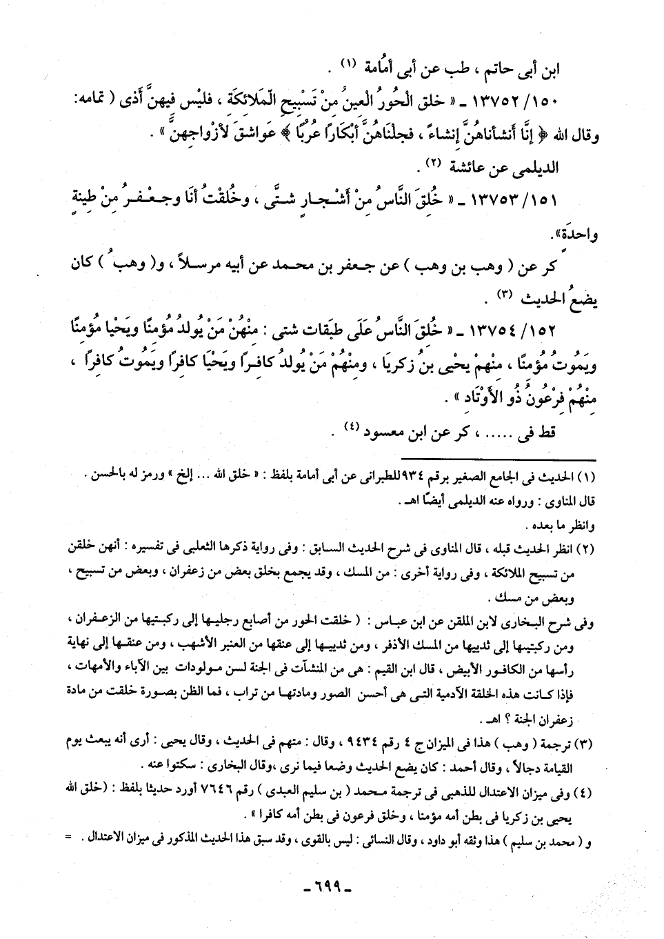 (¬2) انظر الحديث قبله، قال المناوى في شرح الحديث السابق: وفى رواية ذكرها الثعلبى في تفسيره: أنهن خلقن من تسبيح الملائكة، وفى رواية أخرى: من المسك، وقد يجمع بخلق بعض من زعفران، وبعض من تسبيح، وبعض من مسك.