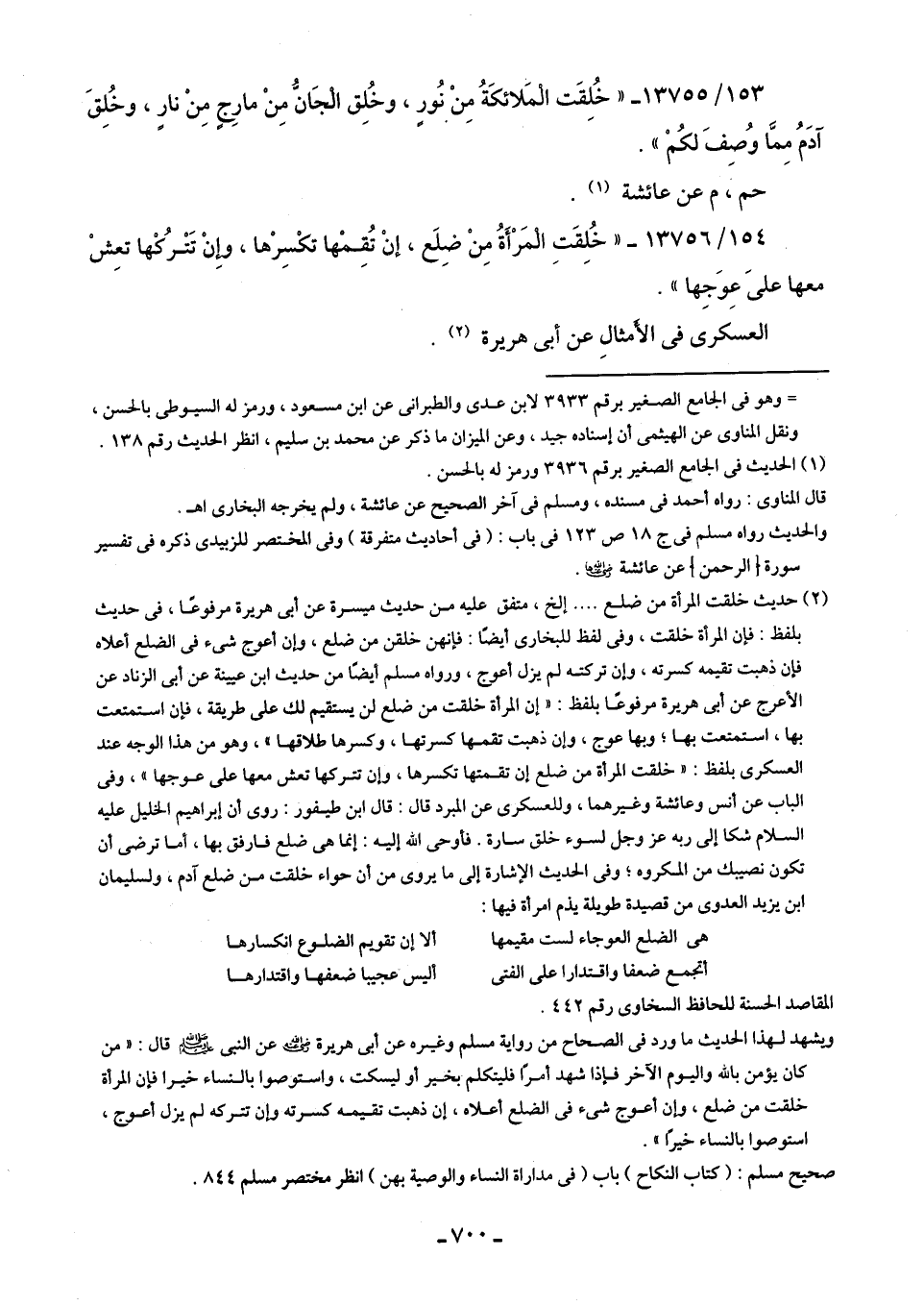 (¬2) حديث خلقت المرأة من ضلع. . . إلخ، متفق عليه من حديث ميسرة عن أَبى هريرة مرفوعًا، في حديث بلفظ: فإن المرأة خلقت، وفى لفظ للبخارى أيضا: فإنهن خلقن من ضلع، وإن أعوج شئ في الضلع أعلاه فإن ذهبت تقيمه كسرته، وإن تركته لم يزل أعوج، ورواه مسلم أيضًا من حديث ابن عيينة عن أَبى الزناد عن الأعرج عن أَبى هريرة مرفوعًا بلفظ: "إن المرأة خلقت من ضلع لن يستقيم لك على طريقة، فإن استمتعت بها، استمتعت بها؛ وبها عوج، وإن ذهبت تقمها كسرتها، وكسرها طلاقها"، وهو من هذا الوجه عند العسكرى بلفظ: "خلقت المرأة من ضلع إن تقمتها تكسرها، وإن تركها تعش معها على عوجها"، وفى الباب عن أنس وعائشة وغيرهما، وللعسكرى عن المبرد قال: قال ابن طيفور: روى أن إبراهيم الخليل عليه السلام شكا إلى ربه عز وجل لسوء خلق سارة. فأوحى اللَّه إليه: إنما هى ضلع فارفق بها، أما ترضى أن تكون نصيبك من المكروه؛ وفى الحديث الإشارة إلى ما يروى من أن حواء خلقت من ضلع آدم، ولسليمان ابن يزيد العدوى من قصيدة طويلة يذم امرأة فيها: