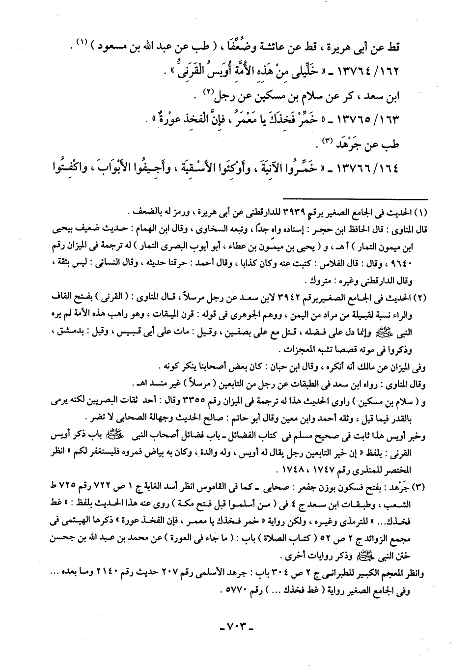 وانظر المعجم الكبير للطبرانى جـ 2 ص 304 باب: جرهد الأسلمى رقم 207 حديث رقم 2140 وما بعده. . . وفى الجامع الصغير رواية (غط فخذك. . .) رقم 5770.