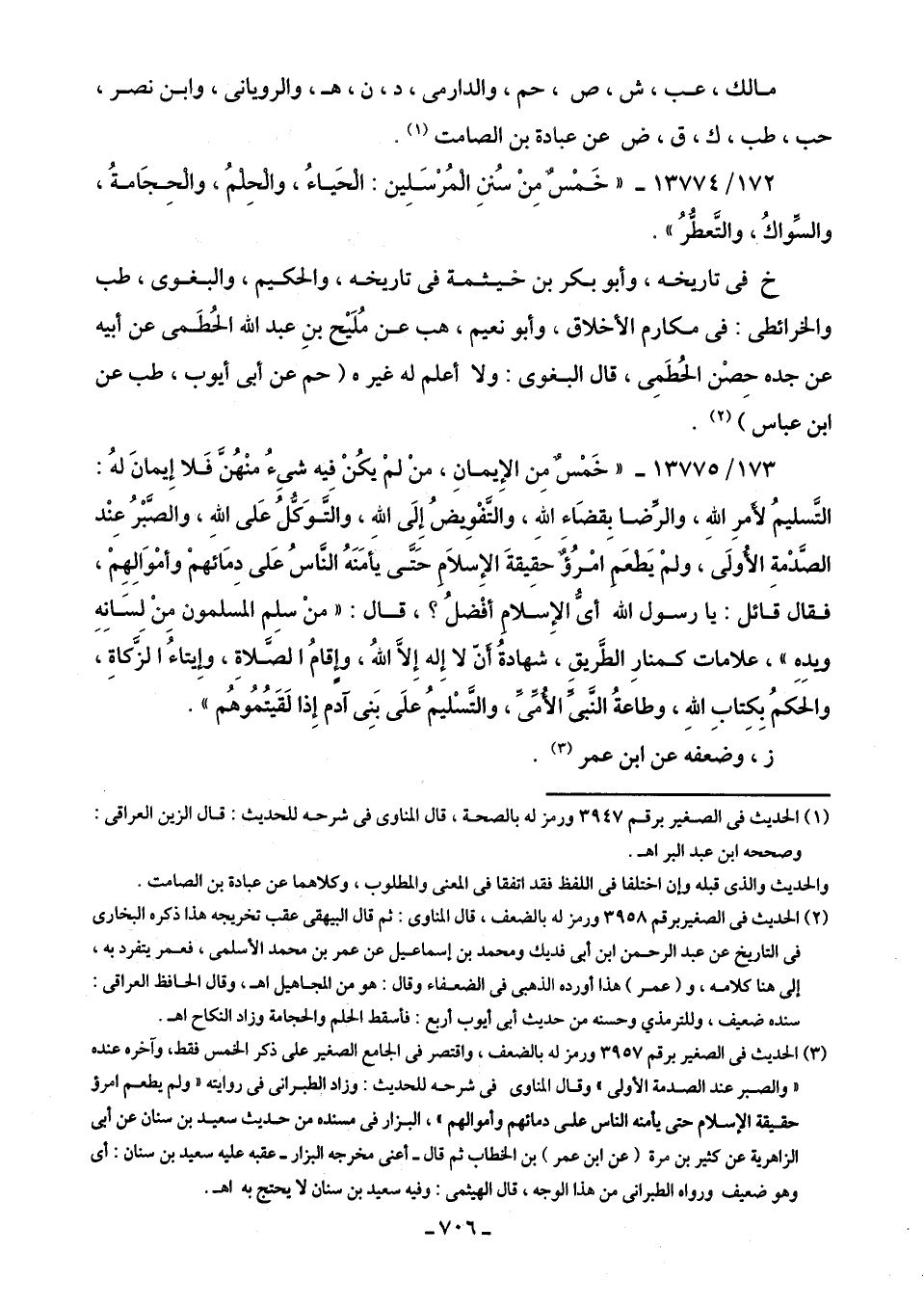 173/ 13775 - "خَمْسٌ مِن الإِيمانِ، منْ لمْ يكُنْ فيه شئُ منْهُنَّ فلا إِيمانَ لهُ: التَّسليمُ لأَمرِ اللَّهِ، والرِّضا بقضَاء اللَّهِ، والتَّفْوِيضُ إِلَى اللَّهِ، والتَّوَكُّلُ عَلى اللَّهِ، والصَّبْرُ عِنْد الصَّدْمةِ الأُوَلَى، وَلَمْ يَطْعَمَ امْرُؤٌ حقِيقةَ الإِسلَام حَتَّى يأمَنَهُ النَّاسُ عَلى دِمَائهم وأمْوَالِهِمْ، فقال قائل: يا رسول اللَّه أىُّ الإِسلام أَفْضلُ؟ ، قال: "من سلِم المسلمون منْ لِسَانِهِ ويدِهِ"، علامات كمنارِ الطَّريق، شهادةُ أن لا إِله إِلا اللَّهُ، وإقامُ الصَّلاةِ، وإِيتاءُ الزَّكَاةِ، والحكمُ بِكِتابِ اللَّهِ، وطاعةُ النَّبىَّ الأُمِّىِّ، والتَّسْليمُ علَى بَنِى آدم إِذا لَقَيتُمُوهُم".