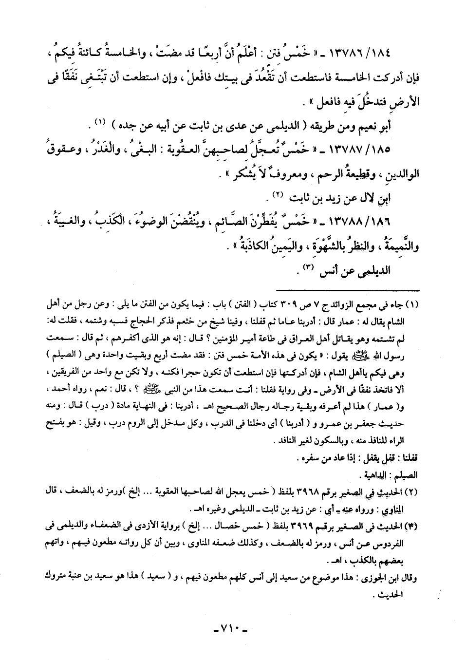 (¬2) الحديث فِى الصغير برقم 3968 بلفظ (خمس يعجل اللَّه لصاحبها العقوبة. . . إلخ) ورمز له بالضعف، قال المناوى: ورواه عنه -أى: عن زيد بن ثابت- الديلمى وغيره اهـ.