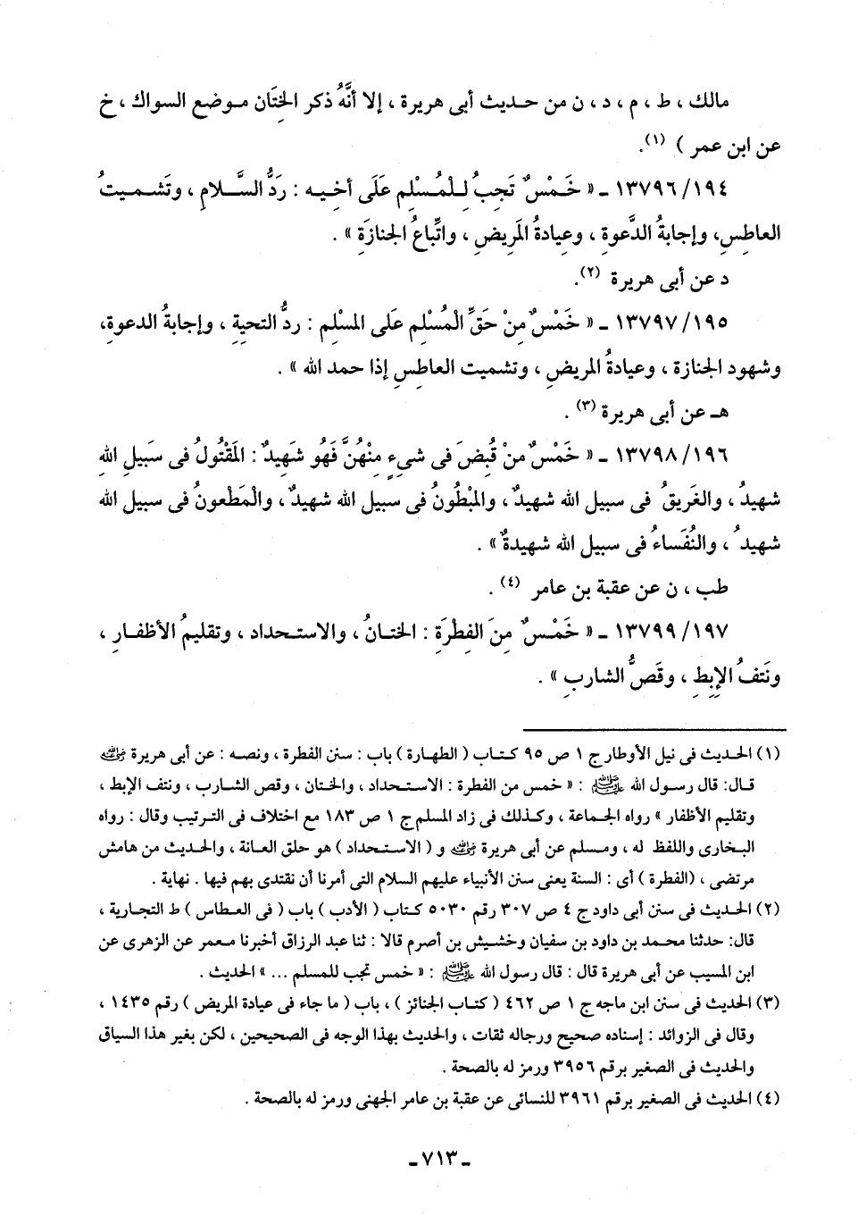 (¬2) الحديث في سنن أَبى داود جـ 4 ص 307 رقم 5030 كتاب (الأدب) باب (في العطاس) ط التجارية، قال: حدثنا محمد بن داود بن سفيان وخشيش بن أصرم قالا: ثنا عبد الوزاق أخبرنا معمر عن الزهرى عن ابن المسيب عن أَبى هريرة قال: قال رسول اللَّه -صلى اللَّه عليه وسلم-: "خمس تجب للمسلم. . . " الحديث.