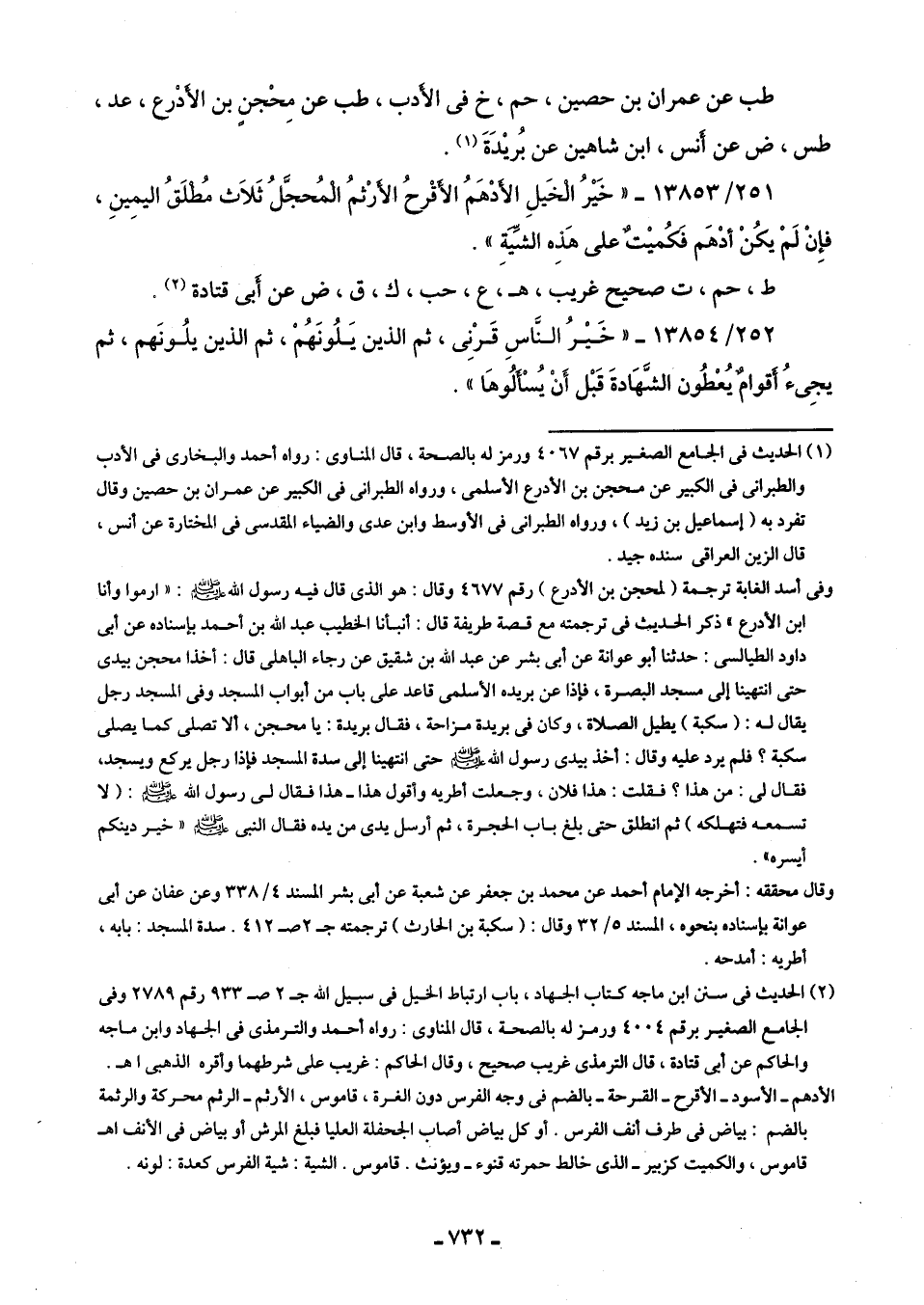 251/ 13853 - "خَيْرُ الخَيلِ الأَدْهَمُ الأَقْرحُ الأَرْثمُ المُحجَّلُ ثَلَاث مُطْلَقُ اليمِينِ، فإِنْ لَمْ يكُنْ أدْهَم فَكُميْتٌ على هَذه الشِّيَةَ".