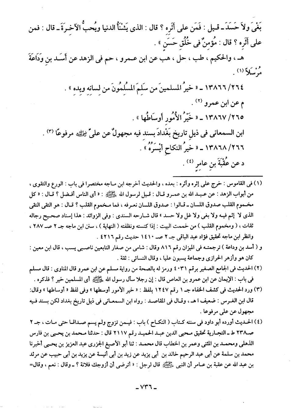 (¬3) ورد الحديث في كشف الخفاء جـ 1 رقم 1247 بلفظ: "خير الأمور أوسطها" وفى لفظ "أوساطها" وقال: قال ابن الغرس: ضعيف اهـ، وقال في المقاصد: رواه ابن السمعانى في ذيل تاريخ بغداد لكن بسند فيه مجهول عن على مرفوعا.