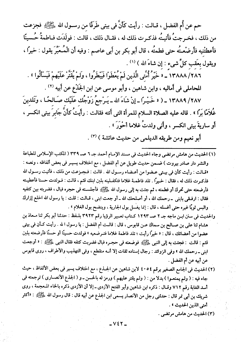 والحديث في سنن ابن ماجه جـ 2 ص 1293 كتاب تعبير الرؤيا رقم 3923 بلفظ: حدثنا أبو بكر ثنا معاذ بن هشام ثنا على بن صالح بن سماك عن قابوس، قال: قالت أم الفضل: يا رسول اللَّه. رأيت كأن في بيتى عضوا من أعضائك، قال: "خيرًا رأيت؛ تلد فاطمة غلاما فترضعيه" فولدت حسينًا أو حسنًا فأرضعته بلبن قثم: قالت: فجئت به إلى النبى -صلى اللَّه عليه وسلم- فوضعته في حجره فبال فضربت كتفه فقال النبى -صلى اللَّه عليه وسلم-: "أوجعت ابنى -رحمك اللَّه" وفى الزوائد: رجال إسناده ثقات إلا أنه منقطع، وفى التهذيب والأطراف، روى قابوس عن أبيه عن أم الفضل.