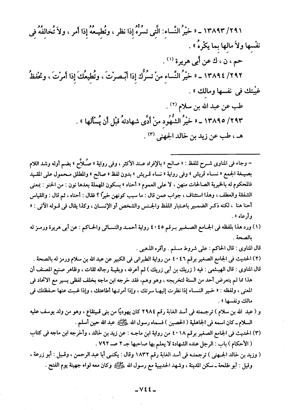 291/ 13893 - "خَيْرُ النِّساءِ: الَّتِى تسُرُّهُ إِذا نظر، وتُطيعُهُ إِذا أَمر، ولَا تُخالِفُهُ فِى نَفْسِها ولَا مالِها بِما يكْرهُ".