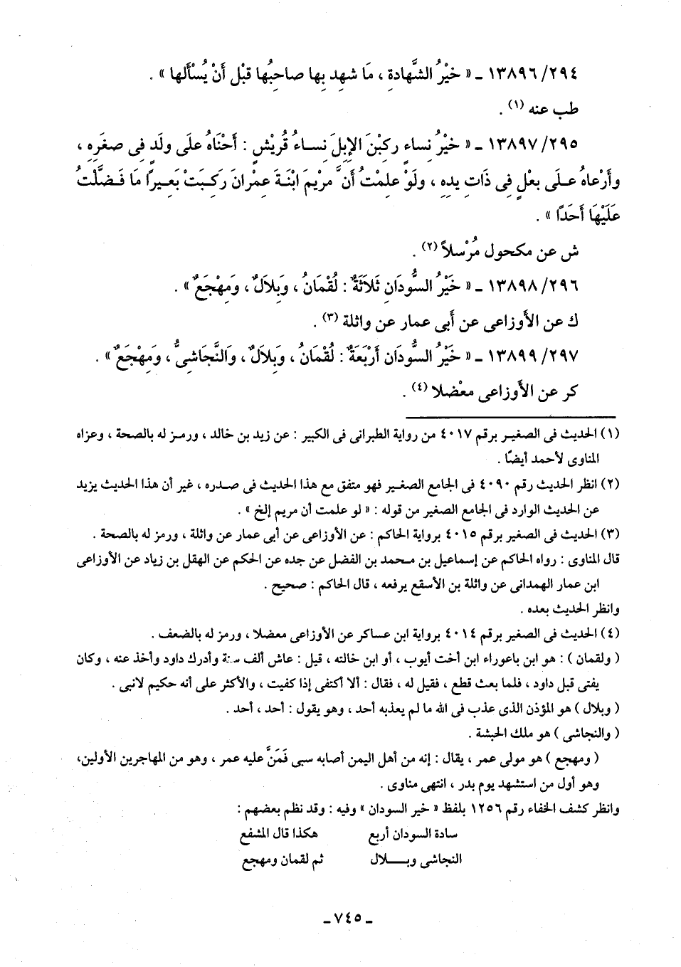 297/ 13899 - "خَيْرُ السُّودَان أَرْبَعَة: لُقْمَانُ، وَبِلَالٌ، وَالنَّجَاشِىُّ، وَمِهْجَعٌ".