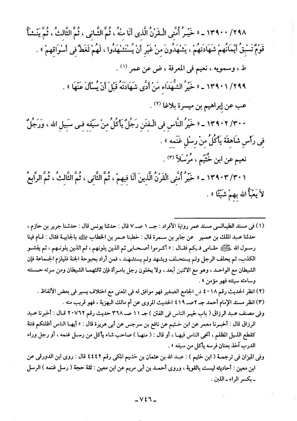 298/ 13900 - "خَيْرُ أُمَّتِى القَرْنُ الَّذى أَنَا مِنْهُ، ثُمَّ الثَّانِى، ثُمَّ الثَّالِثُ، ثمَّ يَنْشَأُ قَوْمٌ تَسْبِقُ أَيْمَانُهمْ شَهَادَتهُم، يَشْهَدُونَ مِن غَيْرِ أَنْ يستَشْهَدُوا، لَهُمْ لَغطٌ في أَسوَاقِهِمْ".