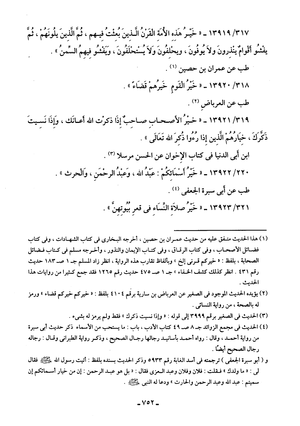 317/ 13919 - "خَيْرُ هَذه الأُمَةِ الْقَرْنُ الَّذِينَ بُعِثْتُ فِيهم، ثُمَّ الَّذِينَ يلُونَهُمْ، ثُمَّ يفْشُو أَقْوامٌ ينْدرونَ ولَا يُوفُونَ، ويحْلِفُونَ وَلَا يُسْتحْلَفُونَ، وَيَفْشُو فِيهِمُ السِّمنُ".