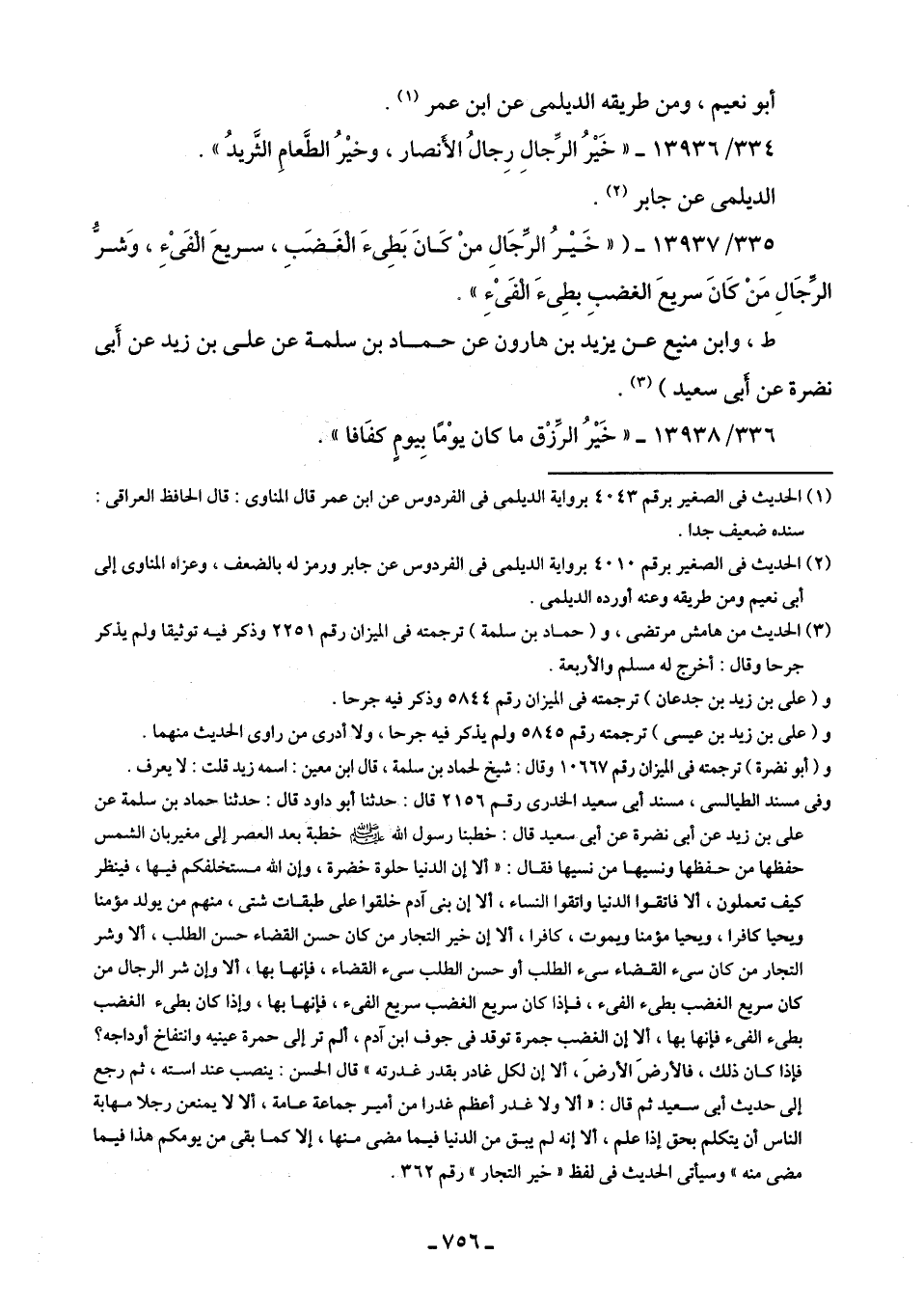 335/ 13937 - ("خَيرُ الرِّجَال منْ كان بَطِئَ الْغَضَبِ، سريعَ الْفَىْءِ، وَشرُّ الرِّجَالِ مَنْ كَانَ سريعَ الغضبِ بطِئَ الْفَىْءِ".