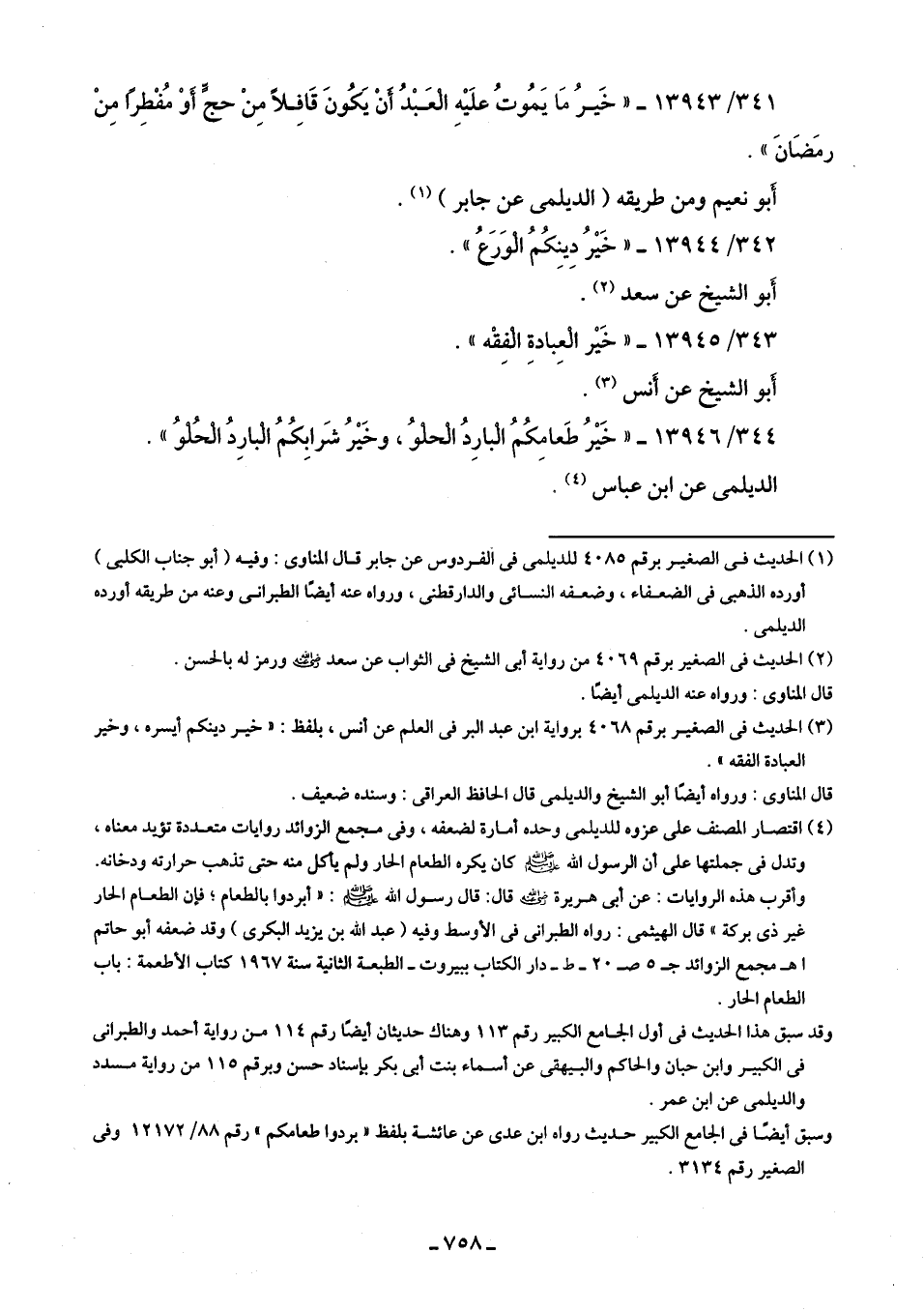 344/ 13946 - "خَيْرُ طَعامِكُمُ البارِدُ الحلوُ، وخَيْرُ شَرابِكُمُ البارِدُ الحُلْوُ".