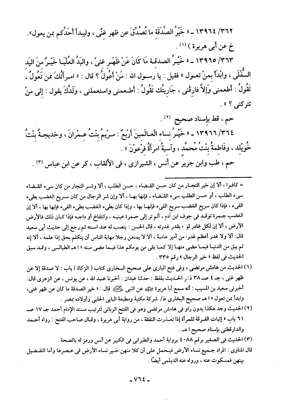 363/ 13965 - "خَيْرُ الصدقِة مَا كانَ عَن ظَهْرِ غِنًى، واليَدُ العُلْيَا خيْرٌ مِنَ اليَدِ السُّفْلَى، وابْدَأْ بِمن تعول" فقيل: يا رسول اللَّه: مَنْ أَعُولُ؟ قال: "أمرأَتُكَ ممن تَعُولُ، تَقُولُ: أَطعمنى وَإِلَّا فارِقْنى، جَارِيتُك تَقُول: أَطعمنى واستعملنى، وَلَدُكَ يقول: إِلى منْ تتركنى؟ ".
