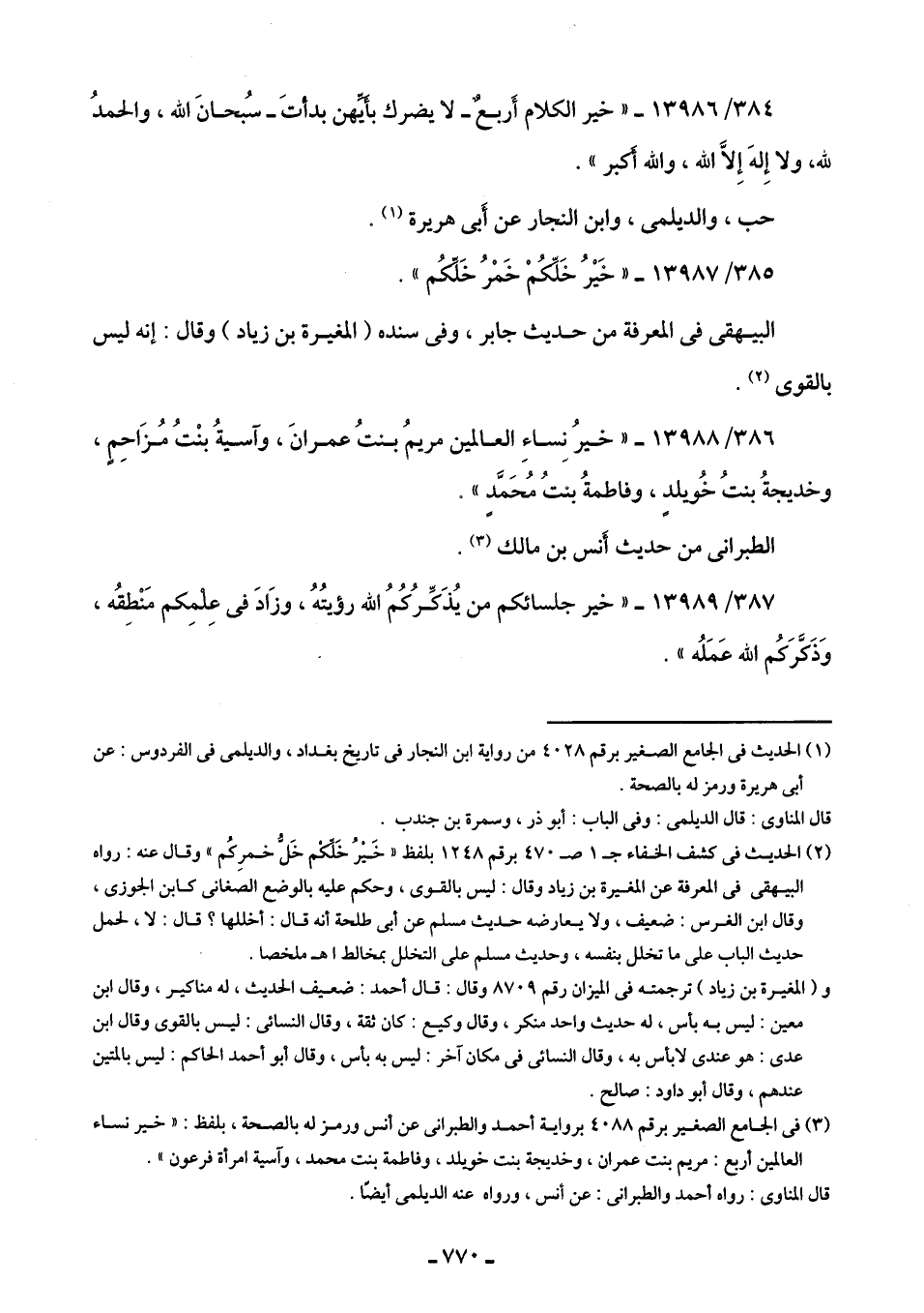 (¬3) في الجامع الصغير برقم 4088 برواية أحمد والطبرانى عن أَنس ورمز له بالصحة، بلفظ: "خير نساء العالمين أربع: مريم بنت عمران، وخديجة بنت خويلد، وفاطمة بنت محمد، وآسية امرأة فرعون".