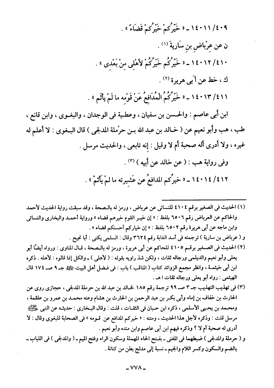 (¬3) في تهذيب التهذيب جـ 3 ص 99 ترجمة رقم 185 لخالد بن عبد اللَّه بن حرملة المدلجى، حجازى روى عن الحارث بن خفاف بن إماء وأبى بكر بن عبد الرحمن بن الحارث بن هشام وعنه محمد بن عمرو بن علقمة، ومحمد بن يحيى الأسلمى، ذكره ابن حبان في الثقات، قلت: وقال البخارى: حديثه عن النبى -صلى اللَّه عليه وسلم- مرسل قلت: وذكره لأجل هذا الحديث، ومتنه: "خَيْرُكم المدافع عن قومه" في الصحابة للبغوى وقال: لا أدرى له صحبة أم لا؟ وذكره فيهم ابن أَبى عاصم وابن منده وأَبو نعيم.