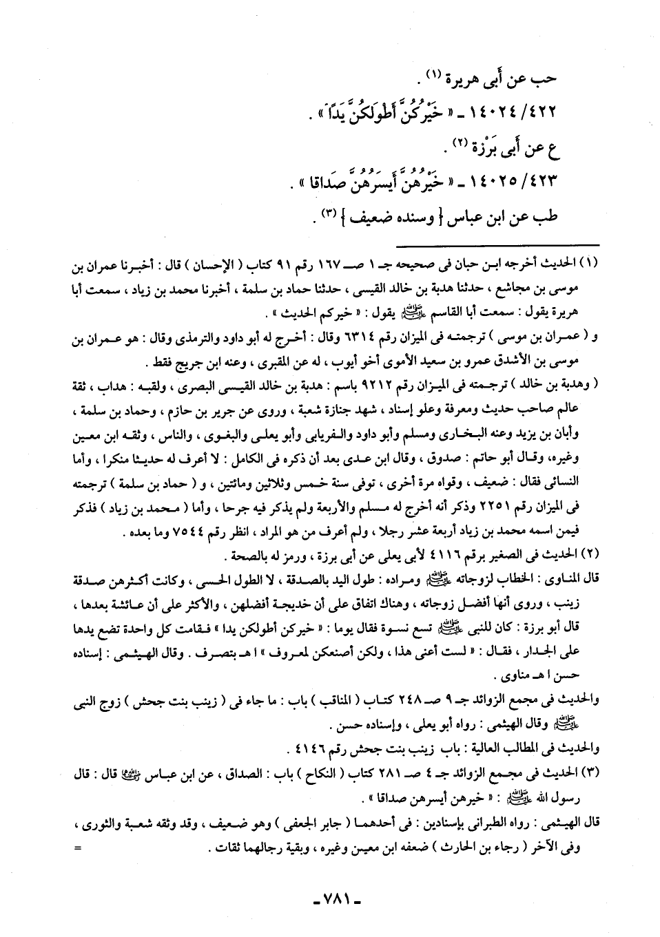 (¬1) الحديث أخرجه ابن حبان في صحيحه جـ 1 ص 167 رقم 91 كتاب (الإحسان) قال: أخبرنا عمران بن موسى بن مجاشع، حدثنا هدبة بن خالد القيسى، حدثنا حماد بن سلمة، أخبرنا محمد بن زياد، سمعت أبا هريرة يقول: سمعت أبا القاسم -صلى اللَّه عليه وسلم- يقول: "خيركم الحديث".