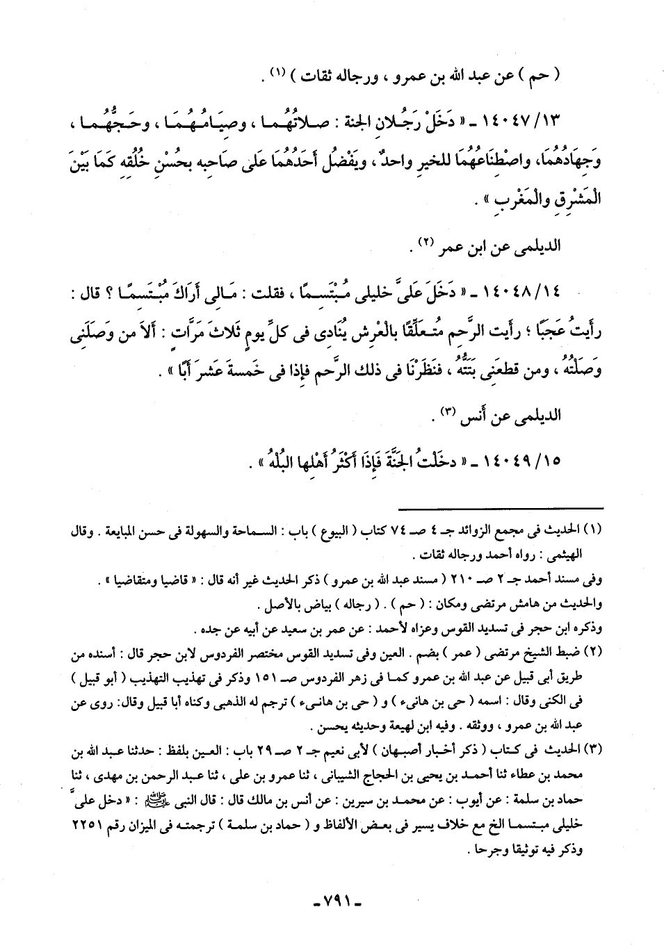 14/ 14048 - "دَخَلَ عَلىَّ خليلى مُبْتَسِمًا، فقلت: مَالِى أَرَاكَ مُبْتَسِمًا؟ قال: رأَيتُ عَجَبًا؛ رأيت الرَّحِم مُتعَلِّقًا بالْعْرِش يُنَادِى في كلِّ يومٍ ثَلاثَ مَرَّاتٍ. أَلَا من وَصَلَنِى وَصَلتُهُ، ومن قطعَنِى بَتَتُّهُ، فنَظَرْنَا في ذلك الرَّحم فإِذا في خَمسةَ عَشرَ أَبًا".