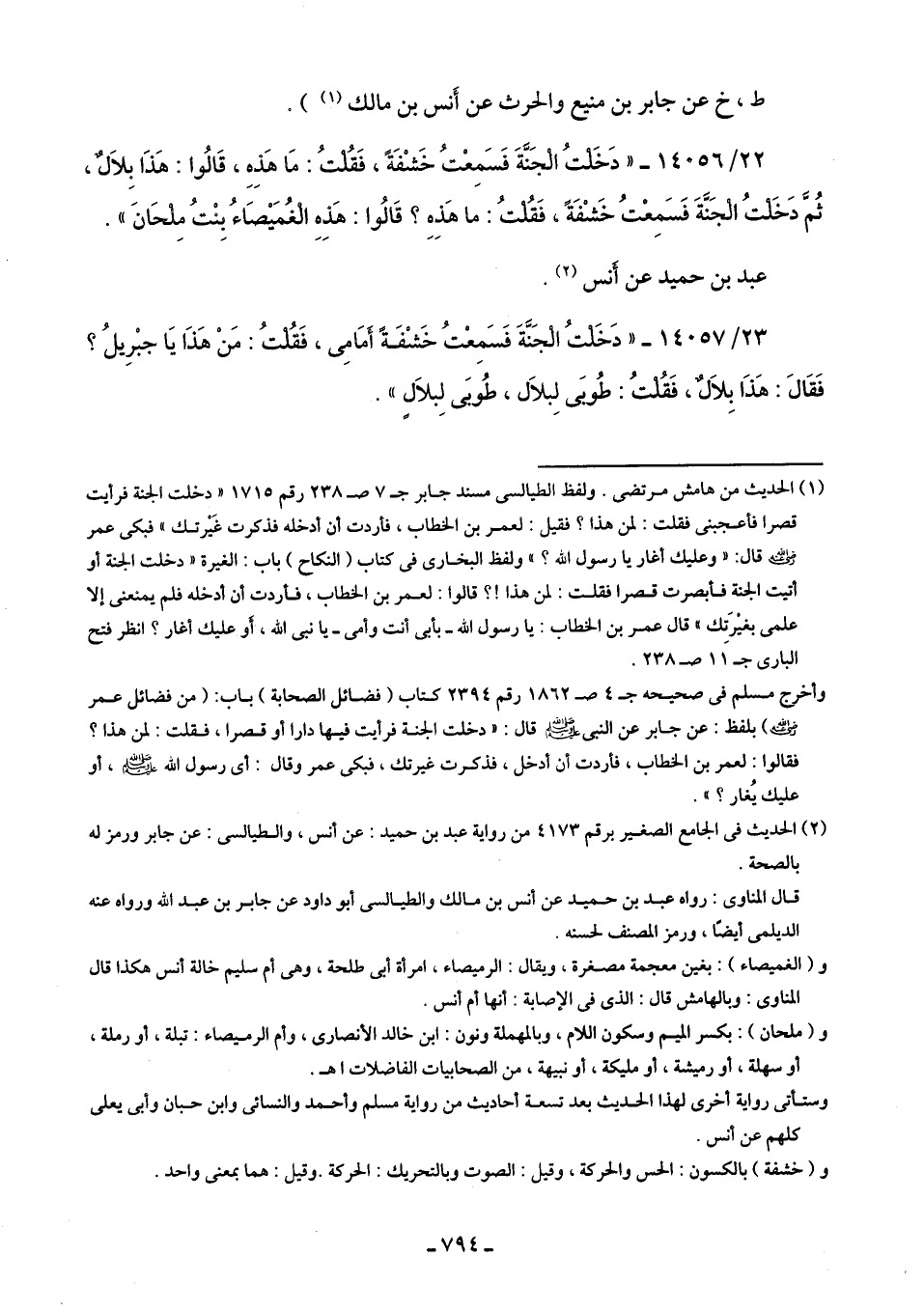 22/ 14056 - "دَخَلْتُ الْجَنَّةَ فَسَمِعْتُ خَشْفَةً، فَقُلتُ: مَا هَذِهِ، قَالُوا: هَذَا بِلَالٌ، ثُمَّ دَخَلتُ الْجَنَّةَ فَسَمِعْتُ خَشْمَةً، لقُلتُ: ما هَذِهِ؟ قَالُوا: هَدهِ الْغُمَيْصَاءُ بِنْتُ مِلْحَانَ".