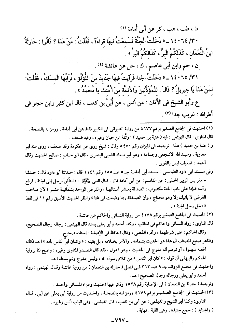 وترجمة (حارثة بن النعمان) في الإصابة رقم 1528 وذكر فيها الحديث وعزاه للنسائى وأحمد.