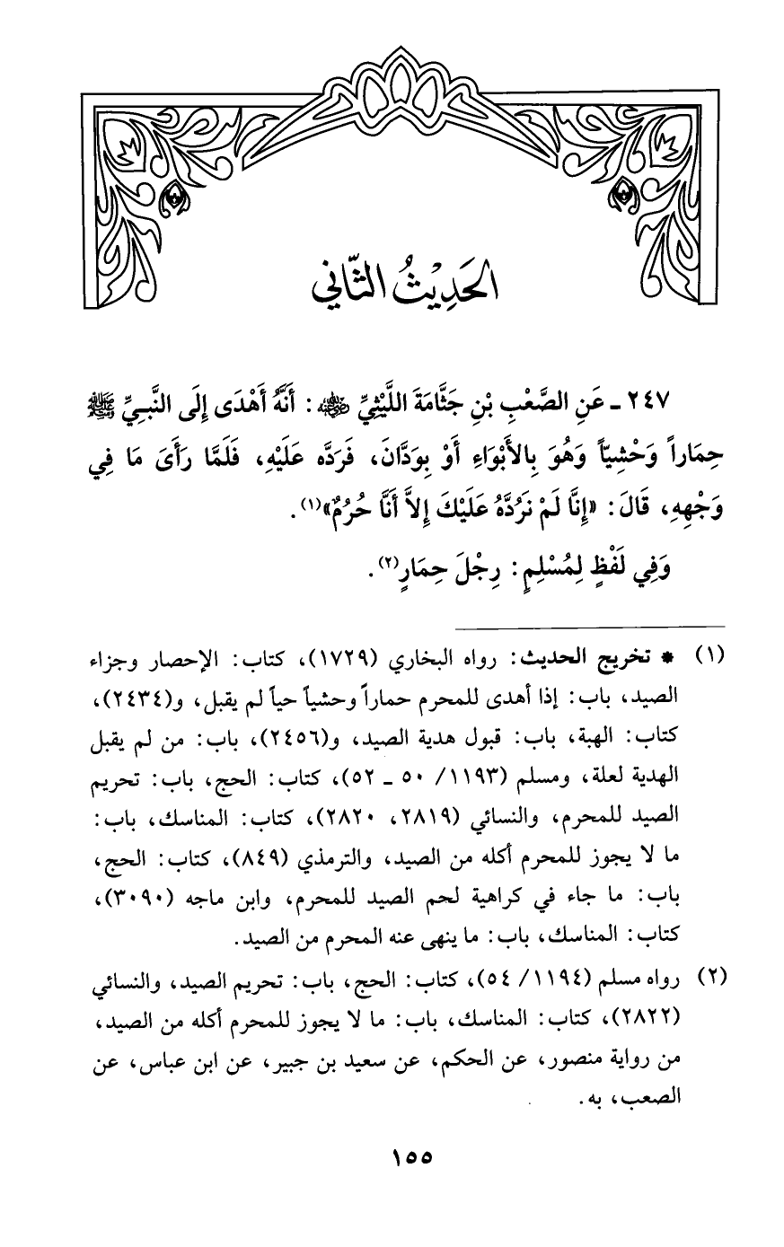 247 - عَنِ الصَّعْبِ بْنِ جَثَّامَةَ اللَّيْثيِّ -رضي اللَّه عنه-: أَنَّهُ أَهْدَى إِلَى النَّبِيِّ -صلى اللَّه عليه وسلم- حِمَارًا وَحْشِيًّا وَهُوَ بِالأَبْوَاءَ أَوْ بِوَدَّانَ، فَرَدَّه عَلَيْهِ، فَلَمَّا رَأَىَ مَا فِي وَجْهِهِ، قَالَ: "إِنَّا لَمْ نَرُدَّهُ عَلَيْكَ إِلَّا أَنَّا حُرُمٌ" (¬1).