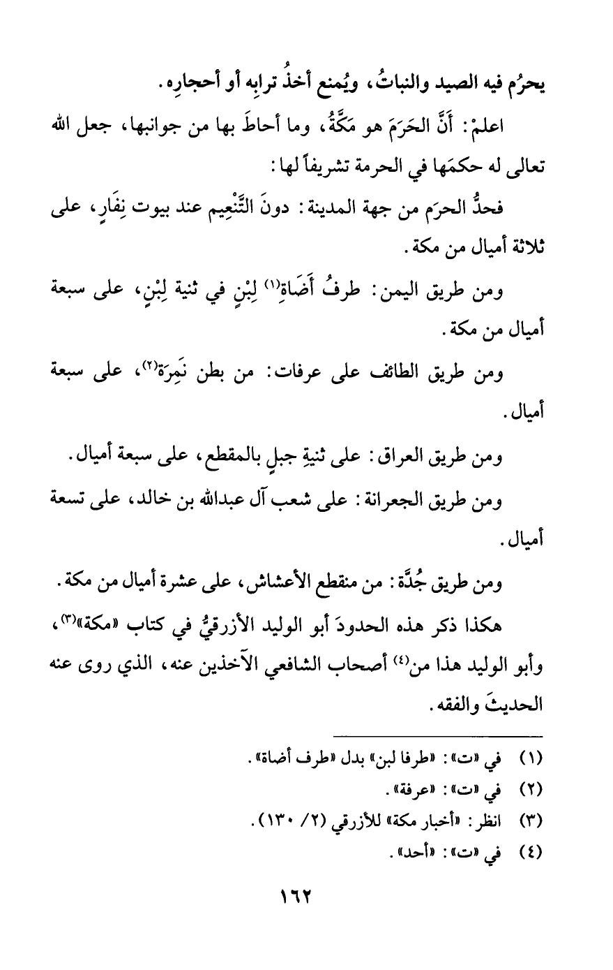 هكذا ذكر هذه الحدودَ أبو الوليد الأزرقيُّ في كتاب "مكة" (¬3)، وأبو الوليد هذا من (¬4) أصحاب الشافعي الآخذين عنه، الذي روى عنه الحديثَ والفقه.