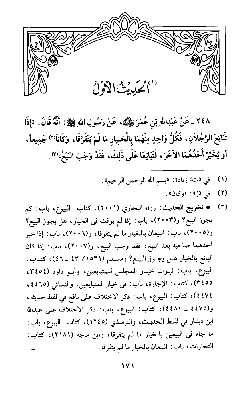 رواه البخاري (2001)، كتاب: البيوع، باب: كم يجوز البيع؟ و (2003)، باب: إذا لم يوقت في الخيار، هل يجوز البيع؟ و (2005)، باب: البيعان بالخيار ما لم يتفرقا، و (2006)، باب: إذا خير أحدهما صاحبه بعد البيع، فقد وجب البيع، و (2007)، باب: إذا كان البائع بالخيار هل يجوز البيع؟ ومسلم (1531/ 43 - 46)، كتاب: البيوع، باب: ثبوت خيار المجلس للمتبايعين، وأبو داود (3454، 3455)، باب: الإجارة، باب: في خيار المتبايعين، والنسائي (4465، 4474)، كتاب: البيوع، باب: ذكر الاختلاف على نافع في لفظ حديثه، و (4475 - 4480)، كتاب: البيوع، باب: ذكر الاختلاف على عبد اللَّه ابن دينار في لفظ الحديث، والترمذي (1245)، كتاب: البيوع، باب: ما جاء في البيعين بالخيار ما لم يتفرقا، وابن ماجه (2181)، كتاب: التجارات، باب: البيعان بالخيار ما لم يتفرقا. =