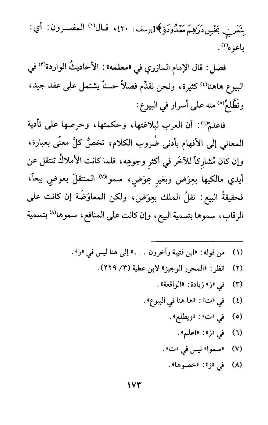 فصل: قال الإمام المازري في "معلمه": الأحاديثُ الواردة (¬3) في البيوع هاهنا (¬4) كثيرة، ونحن نقدِّم فصلًا حسنًا يشتمل على عقد جيد، وتَطَّلعُ (¬5) منه على أسرار في البيوع: