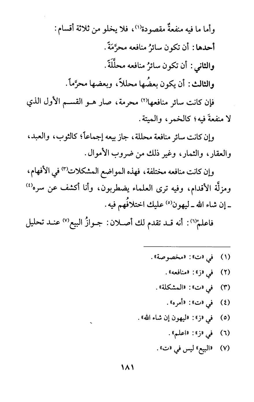 وإن كانت منافعه مختلفة، فهذه المواضع المشكلات (¬3) في الأفهام، ومزلَّة الأقدام، وفيه ترى العلماء يضطربون، وأنا أكشف عن سره (¬4) -إن شاء اللَّه- ليهون (¬5) عليك اختلافُهم فيه.