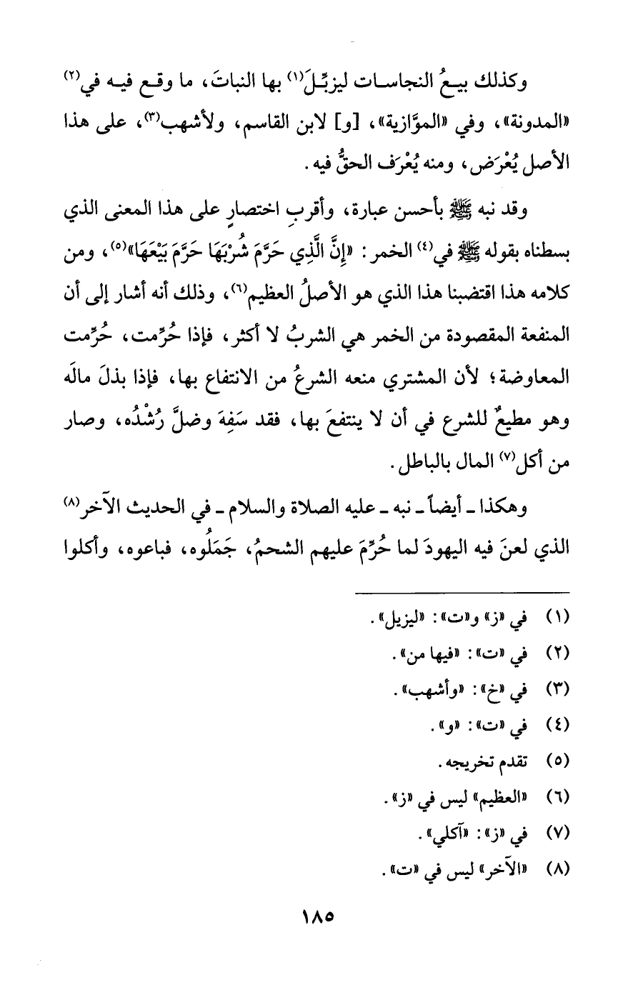 وقد نبه -صلى اللَّه عليه وسلم- بأحسن عبارة، وأقربِ اختصارٍ على هذا المعنى الذي بسطناه بقوله -صلى اللَّه عليه وسلم- في (¬4) الخمر: "إِنَّ الَّذِي حَرَّمَ شُرْبَهَا حَرَّمَ بَيْعَهَا" (¬5)، ومن كلامه هذا اقتضبنا هذا الذي هو الأصلُ العظيم (¬6)، وذلك أنه أشار إلى أن المنفعة المقصودة من الخمر هي الشربُ لا أكثر، فإذا حُرِّمت، حُرِّمت المعاوضة؛ لأن المشتري منعه الشرعُ من الانتفاع بها، فإذا بذلَ مالَه وهو مطيعٌ للشرع في أن لا ينتفعَ بها، فقد سَفِهَ وضلَّ رُشْدُه، وصار من أكل (¬7) المال بالباطل.