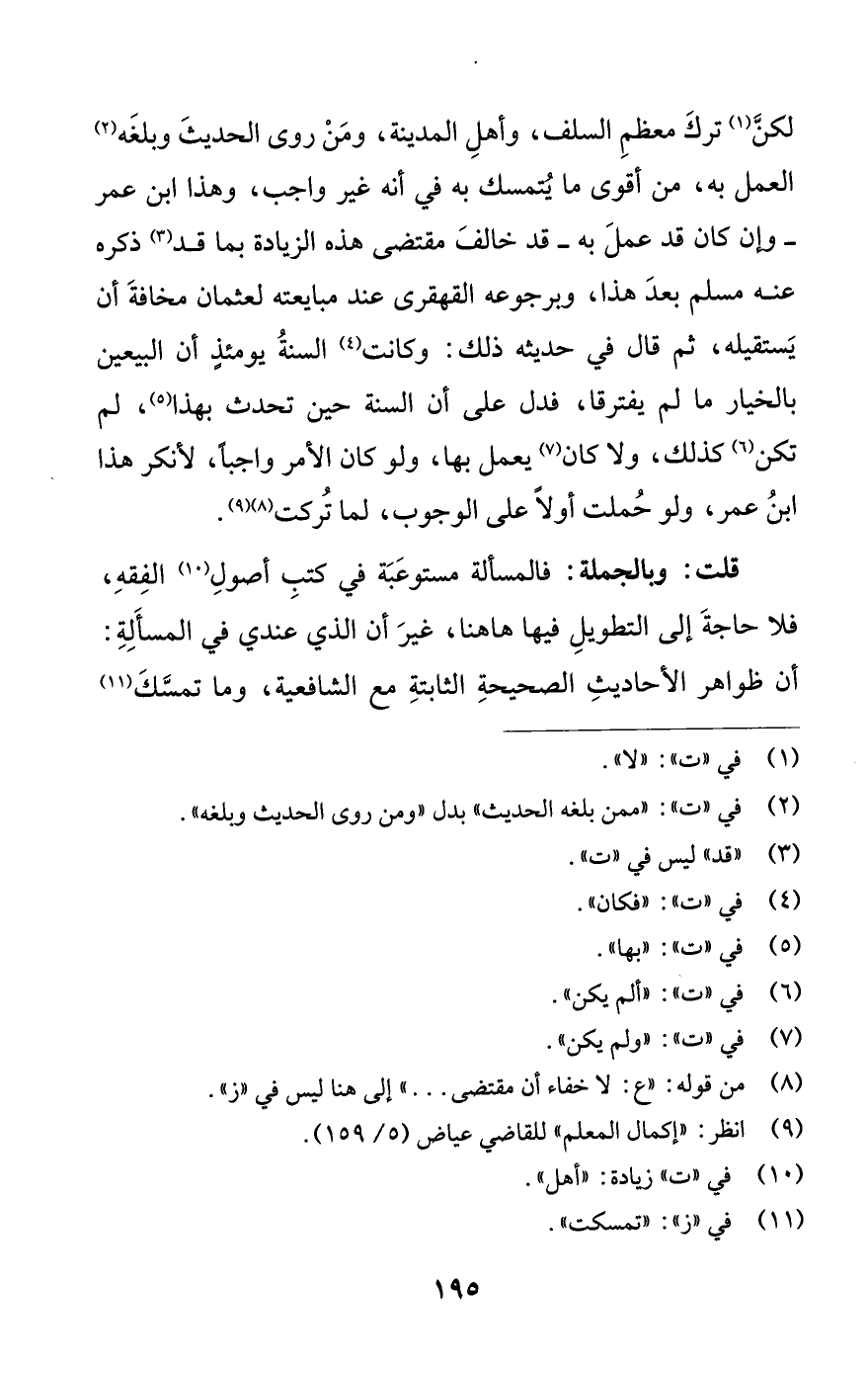 لكنَّ (¬1) تركَ معظمِ السلف، وأهلِ المدينة، ومَنْ روى الحديثَ وبلغَه (¬2) العمل به، من أقوى ما يُتمسك به في أنه غير واجب، وهذا ابن عمر -وإن كان قد عملَ به- قد خالفَ مقتضى هذه الزيادة بما قد (¬3) ذكره عنه مسلم بعدَ هذا، وبرجوعه القهقرى عند مبايعته لعثمان مخافةَ أن يَستقيله، ثم قال في حديثه ذلك: وكانت (¬4) السنةُ يومئذٍ أن البيعين بالخيار ما لم يفترقا، فدل على أن السنة حين تحدث بهذا (¬5)، لم تكن (¬6) كذلك، ولا كان (¬7) يعمل بها، ولو كان الأمر واجبًا، لأنكر هذا ابنُ عمر، ولو حُملت أولًا على الوجوب، لما تُركت (¬8) (¬9).