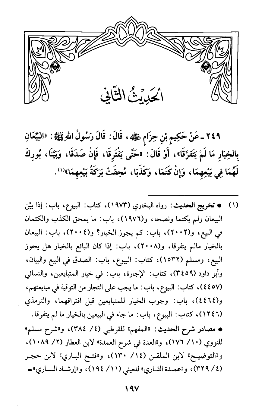 249 - عَنْ حَكِيم بْنِ حِزَامٍ -رضي اللَّه عنه-، قَالَ: قَالَ رَسُولُ اللَّهِ -صلى اللَّه عليه وسلم-: "البَيِّعَانِ بِالخِيَارِ مَا لَمْ يَتَفرَّقَا"، أَوْ قَالَ: "حَتَّى يَفْتَرِقَا، فَإِنْ صَدَقَا، وَبَيَّنَا، بُورِكَ لَهُمَا فِي بَيْعِهِمَا، وَإِنْ كَتَمَا، وَكَذَبَا، مُحِقَتْ بَرَكَةُ بَيْعِهِمَا" (¬1).