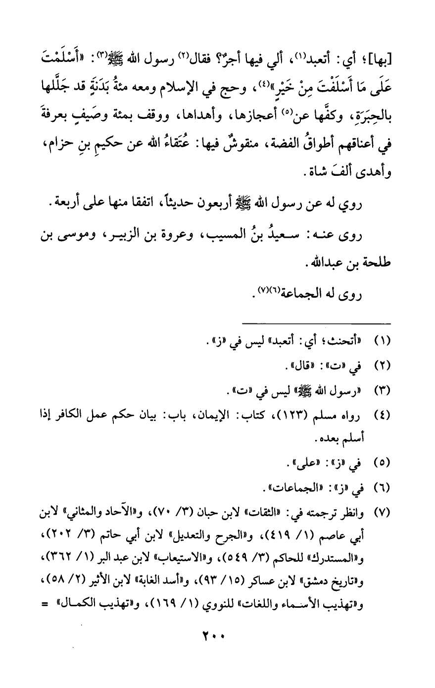 [بها]؛ أي: أتعبد (¬1)، ألي فيها أجرٌ؟ فقال (¬2) رسول اللَّه -صلى اللَّه عليه وسلم- (¬3): "أَسْلَمْتَ عَلَى مَا أَسْلَفْتَ مِنْ خَيْرٍ" (¬4)، وحج في الإسلام ومعه مئةُ بَدَنَةٍ قد جَلَّلها بالحِبَرَةِ، وكفَّها عن (¬5) أعجازها، وأهداها، ووقف بمئة وصَيفٍ بعرفةَ في أعناقهم أطواقُ الفضة، منقوشٌ فيها: عُتَقاءُ اللَّه عن حكيمِ بنِ حزام، وأهدى ألفَ شاة.