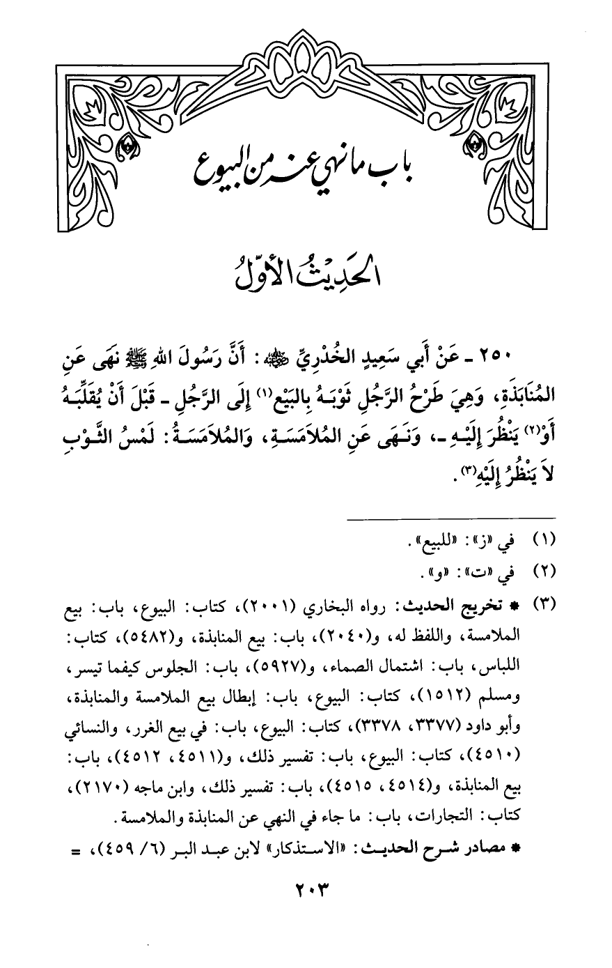 250 - عَنْ أَبي سَعِيدٍ الخُدْرِيِّ -رضي اللَّه عنه-: أَنَّ رَسُولَ اللَّهِ -صلى اللَّه عليه وسلم- نَهَى عَنِ المُنَابَذَةِ، وَهِيَ طَرْحُ الرَّجُلِ ثَوْبَهُ بِالبَيعْ (¬1) إِلَى الرَّجُلِ -قَبْلَ أَنْ يُقَلِّبَهُ أَوْ (¬2) يَنْظُرَ إِلَيْهِ-، وَنَهَى عَنِ المُلَامَسَةِ، وَالمُلَامَسَةُ: لَمْسُ الثَّوْبِ لَا يَنْظُرُ إِلَيْهِ (¬3).