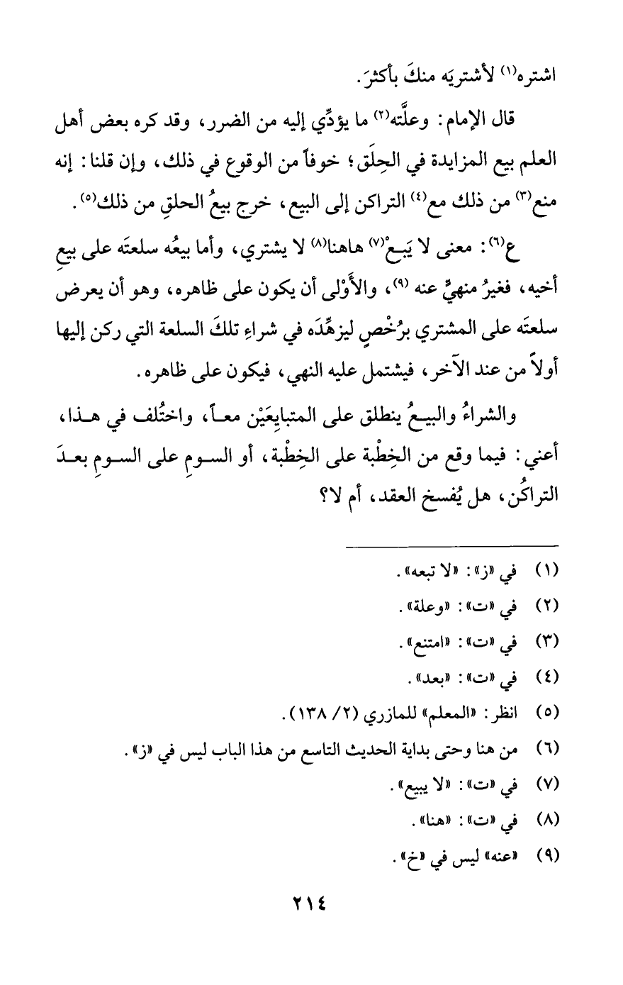 قال الإمام: وعلَّته (¬2) ما يؤدِّي إليه من الضرر، وقد كره بعض أهل العلم بيع المزايدة في الحِلَق؛ خوفًا من الوقوع في ذلك، وإن قلنا: إنه منع (¬3) من ذلك مع (¬4) التراكن إلى البيع، خرج بيعُ الحلقِ من ذلك (¬5).