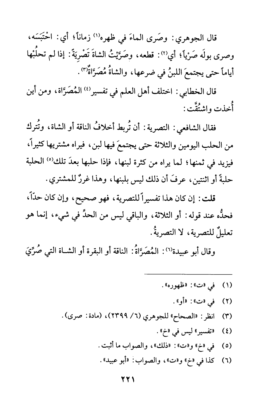 قال الجوهري: وصَرى الماءَ في ظهره (¬1) زمانًا؛ أي: احْتَبَسَه، وصرى بولَه صَرْيًا؛ أي (¬2): قطعه، وصَرَّيْتُ الشاةَ تَصْرِيَةً: إذا لم تحلُبْها أيامًا حتى يجتمعَ اللبنُ في ضرعها، والشاةُ مُصَرَّاةٌ (¬3).