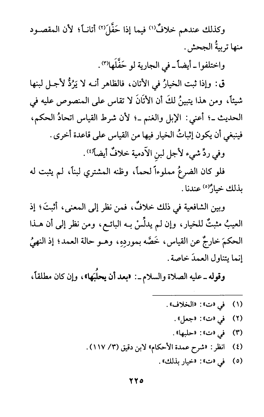 ق: وإذا ثبت الخيارُ في الأتان، فالظاهر أنه لا يَرُدُّ لأجل لبنها شيئًا، ومن هذا يتبينُ لكَ أن الأتَانَ لا تقاس على المنصوص عليه في الحديث -؛ أعني: الإبل والغنم-؛ لأن شرط القياس اتحادُ الحكم، فينبغي أن يكون إثباتُ الخيار فيها من القياس على قاعدة أخرى.