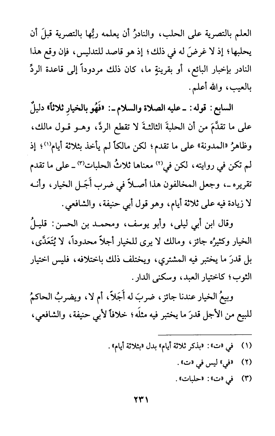 السابع: قوله: -عليه الصلاة والسلام-: "فَهُو بالخيارِ ثلاثًا" دليلٌ على ما تقدَّمَ من أن الحلبةَ الثالثةَ لا تقطع الردَّ، وهو قول مالك، وظاهرُ "المدونة" على ما تقدم؛ لكن مالكًا لم يأخذ بثلاثة أيام (¬1)؛ إذ لم تكن في روايته، لكن في (¬2) معناها ثلاثُ الحلبات (¬3) -على ما تقدم تقريره-، وجعل المخالفون هذا أصلًا في ضرب أَجَل الخيار، وأنه لا زيادة فيه على ثلاثة أيام، وهو قول أبي حنيفة، والشافعي.