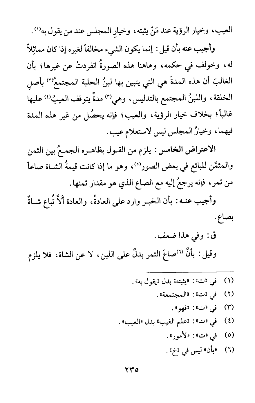 الاعتراض الخامس: يلزم من القول بظاهره الجمعُ بين الثمن والمثمَّن للبائع في بعض الصور (¬5)، وهو ما إذا كانت قيمةُ الشاة صاعًا من تمر، فإنه يرجعُ إليه مع الصاع الذي هو مقدار ثمنها.
