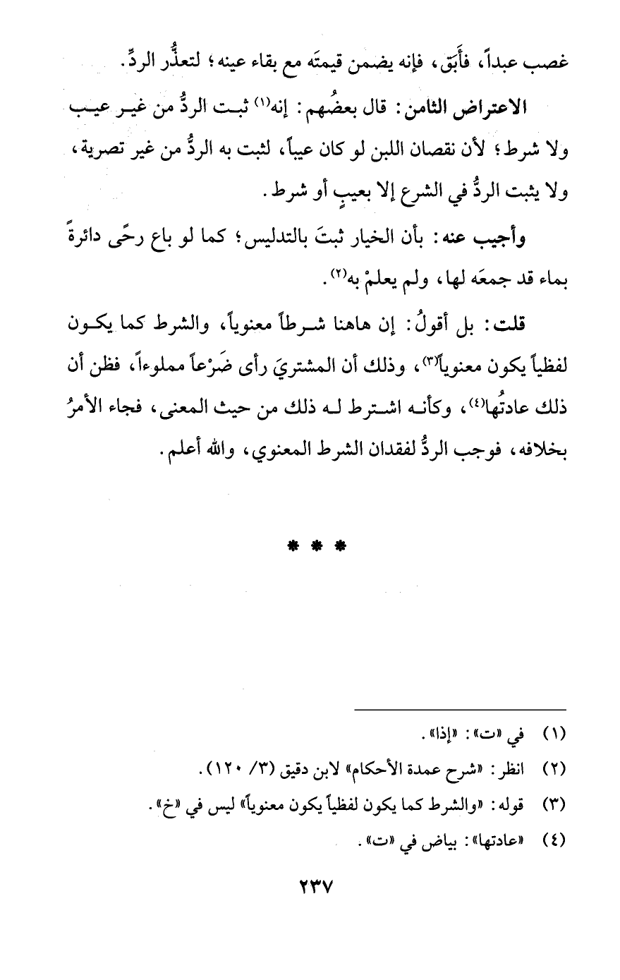 قلت: بل أقولُ: إن هاهنا شرطًا معنويًا، والشرط كما يكون لفظيًا يكون معنويًا (¬3)، وذلك أن المشتريَ رأى ضَرْعًا مملوءًا، فظن أن ذلك عادتُها (¬4)، وكأنه اشترط له ذلك من حيث المعنى، فجاء الأمرُ بخلافه، فوجب الردُّ لفقدان الشرط المعنوي، واللَّه أعلم.