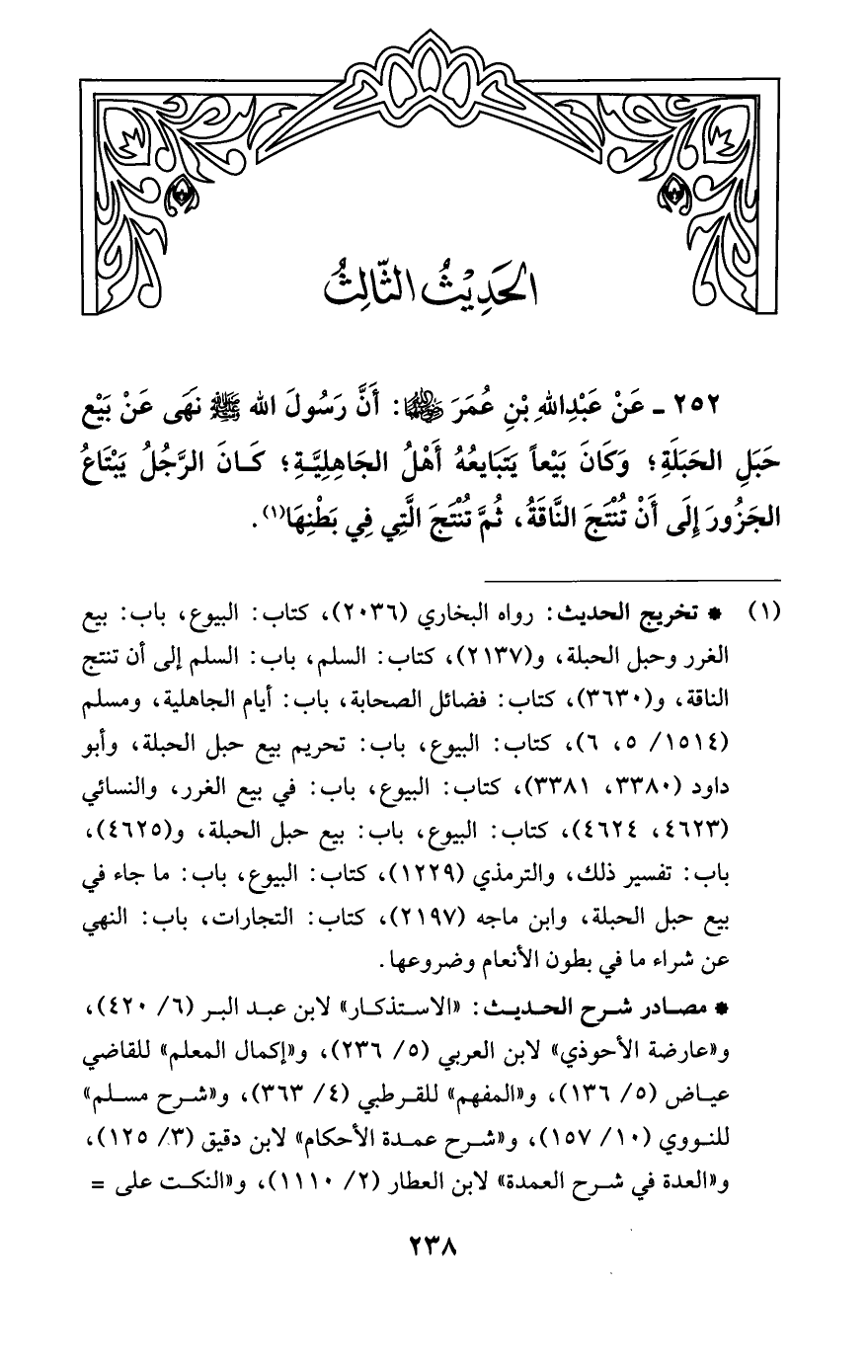 252 - عَنْ عَبْدِ اللَّهِ بْنِ عُمَرَ -رضي اللَّه عنهما-: أَنَّ رَسُولَ اللَّه -صلى اللَّه عليه وسلم- نهَى عَنْ بَيْع حَبَلِ الحَبَلَةِ؛ وَكَانَ بَيْعًا يَتَبَايعُهُ أَهْلُ الجَاهِلِيَّةِ؛ كَانَ الرَّجُلُ يَبْتَاعُ الجَزُورَ إِلَى أَنْ تُنْتَجَ النَّاقَةُ، ثُمَّ تُنْتَجَ الَّتِي فِي بَطْنِهَا (¬1).