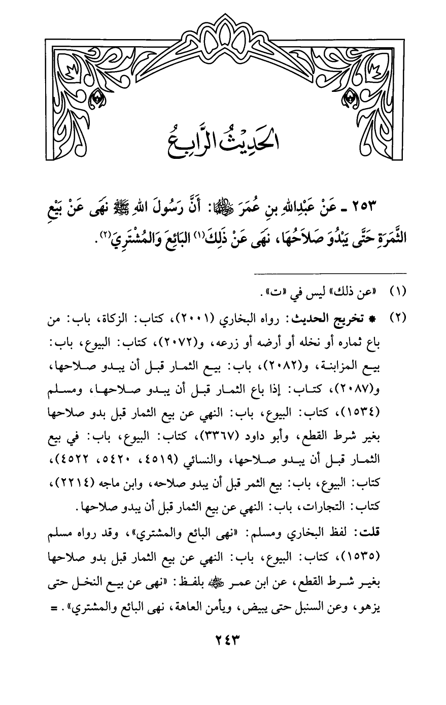 253 - عَنْ عَبْدِ اللَّهِ بنِ عُمَرَ -رضي اللَّه عنهما-: أَنَّ رَسُولَ اللَّهِ -صلى اللَّه عليه وسلم- نَهَى عَنْ بَيْعِ الثَّمَرَةِ حَتَّى يَبْدُوَ صَلَاحُهَا، نَهَى عَنْ ذَلِكَ (¬1) البَائِعَ وَالمُشْتَرِيَ (¬2).