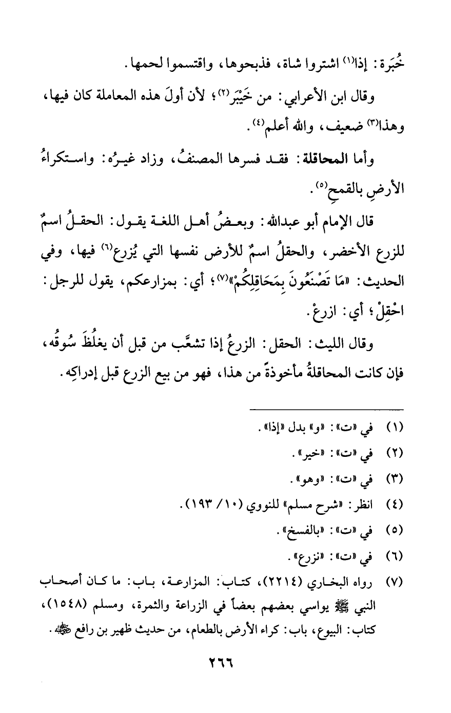 (¬7) رواه البخاري (2214)، كتاب: المزارعة، باب: ما كان أصحاب النبي -صلى اللَّه عليه وسلم- يواسي بعضهم بعضًا في الزراعة والثمرة، ومسلم (1548)، كتاب: البيوع، باب: كراء الأرض بالطعام، من حديث ظهير بن رافع -رضي اللَّه عنه-.