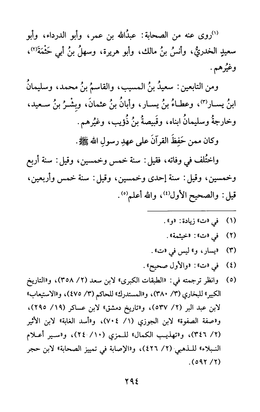 (¬5) وانظر ترجمته في: "الطبقات الكبرى" لابن سعد (2/ 358)، و"التاريخ الكبير" للبخاري (3/ 380)، و"المستدرك" للحاكم (3/ 475)، و"الاستيعاب" لابن عبد البر (2/ 537)، و"تاريخ دمشق" لابن عساكر (19/ 295)، و"صفة الصفوة" لابن الجوزي (1/ 704)، و"أسد الغابة" لابن الأثير (2/ 346)، و"تهذيب الكمال" للمزي (10/ 240)، و"سير أعلام النبلاء" للذهبي (2/ 426)، و"الإصابة في تمييز الصحابة" لابن حجر (2/ 592).