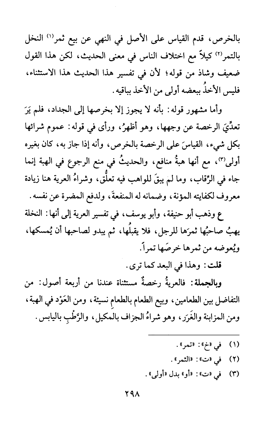 ع وذهب أبو حنيفة، وأبو يوسف، في تفسير العرية إلى أنها: النخلة يهبُ صاحبُها ثمرَها للرجل، فلا يقبلُها، ثم يبدو لصاحبها أن يُمسكها، ويُعوضه من ثمرها خرصَها تمرًا.
