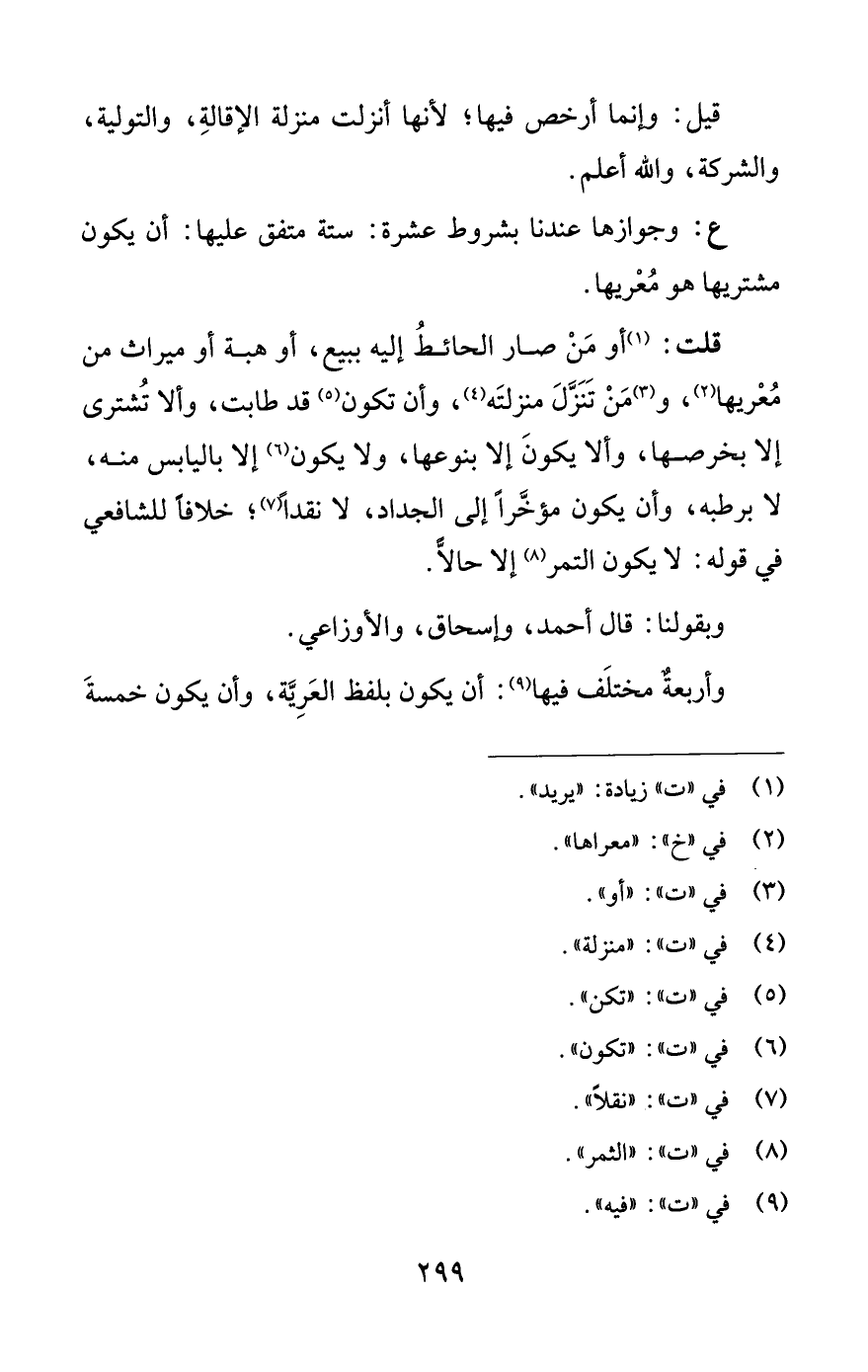 قلت: (¬1) أو مَنْ صار الحائطُ إليه ببيع، أو هبة أو ميراث من مُعْريها (¬2)، و (¬3) مَنْ تَنَزَّلَ منزلتَه (¬4)، وأن تكون (¬5) قد طابت، وألا تُشترى إِلَّا بخرصها، وألا يكونَ إِلَّا بنوعها، ولا يكون (¬6) إِلَّا باليابس منه، لا برطبه، وأن يكون مؤخرًّا إلى الجداد، لا نقدًا (¬7)؛ خلافًا للشافعي في قوله: لا يكون التمر (¬8) إِلَّا حالًّا.